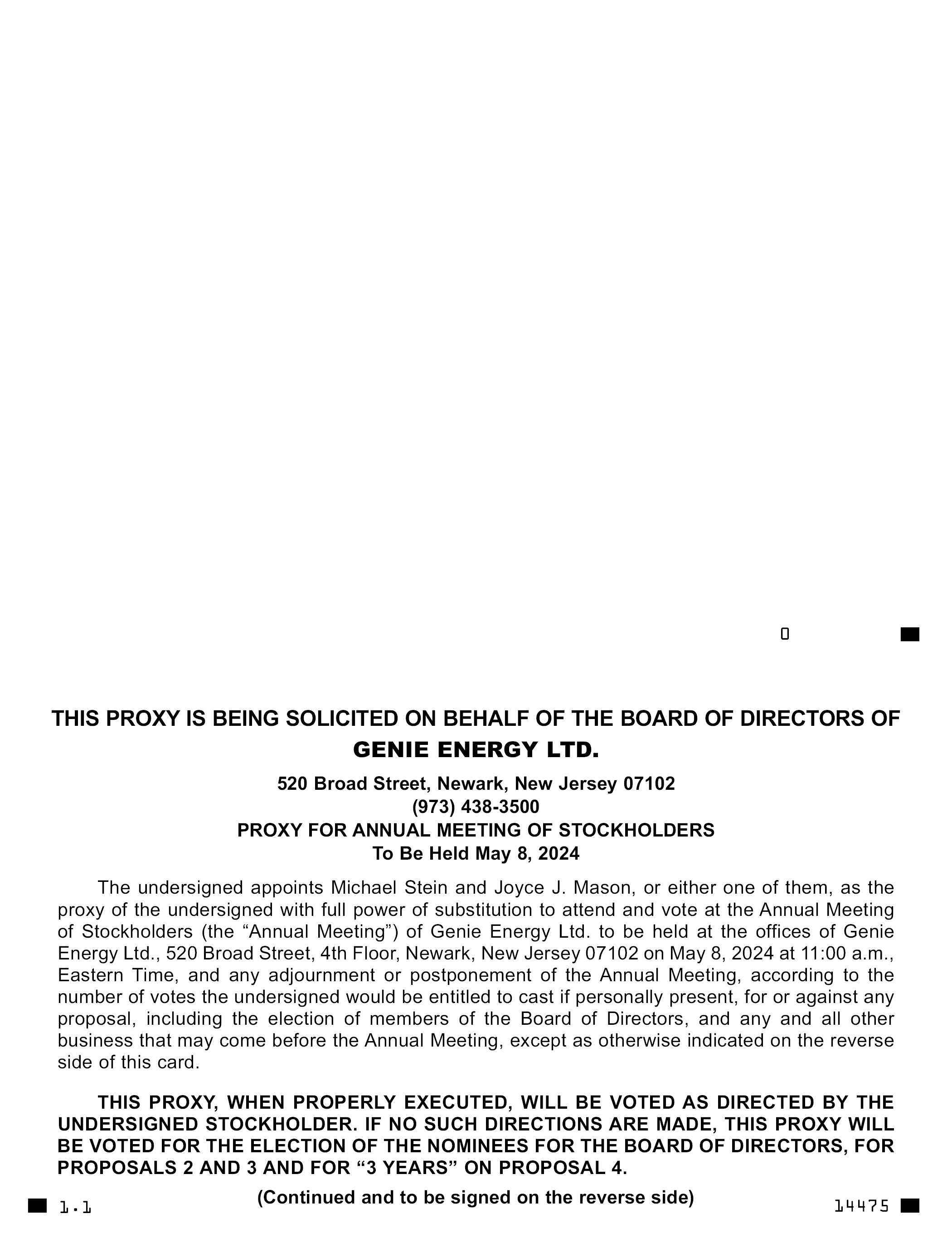 THIS PROXY IS BEING SOLICITED ON BEHALF OF THE BOARD OF DIRECTORS OF GENIE ENERGY LTD. 520 Broad Street, Newark, New Jersey 07102 (973) 438-3500 PROXY FOR ANNUAL MEETING OF STOCKHOLDERS To Be Held May 8, 2024 The undersigned appoints Michael Stein and Joyce J. Mason, or either one of them, as the proxy of the undersigned with full power of substitution to attend and vote at the Annual Meeting of Stockholders (the “Annual Meeting”) of Genie Energy Ltd. to be held at the offices of Genie Energy Ltd., 520 Broad Street, 4th Floor, Newark, New Jersey 07102 on May 8, 2024 at 11:00 a.m., Eastern Time, and any adjournment or postponement of the Annual Meeting, according to the number of votes the undersigned would be entitled to cast if personally present, for or against any proposal, including the election of members of the Board of Directors, and any and all other business that may come before the Annual Meeting, except as otherwise indicated on the reverse side of this card. THIS PROXY, WHEN PROPERLY EXECUTED, WILL BE VOTED AS DIRECTED BY THE UNDERSIGNED STOCKHOLDER. IF NO SUCH DIRECTIONS ARE MADE, THIS PROXY WILL BE VOTED FOR THE ELECTION OF THE NOMINEES FOR THE BOARD OF DIRECTORS, FOR PROPOSALS 2 AND 3 AND FOR “3 YEARS” ON PROPOSAL 4. (Continued and to be signed on the reverse side) 1.1 14475