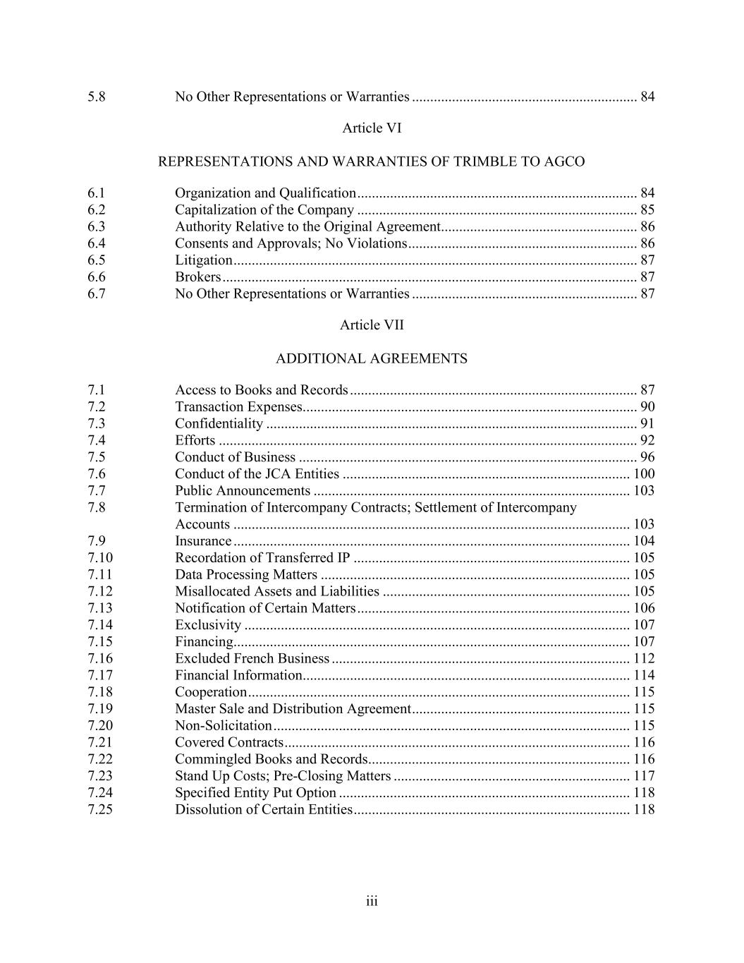 iii 5.8 No Other Representations or Warranties .............................................................. 84 Article VI REPRESENTATIONS AND WARRANTIES OF TRIMBLE TO AGCO 6.1 Organization and Qualification ............................................................................. 84 6.2 Capitalization of the Company ............................................................................. 85 6.3 Authority Relative to the Original Agreement...................................................... 86 6.4 Consents and Approvals; No Violations ............................................................... 86 6.5 Litigation ............................................................................................................... 87 6.6 Brokers .................................................................................................................. 87 6.7 No Other Representations or Warranties .............................................................. 87 Article VII ADDITIONAL AGREEMENTS 7.1 Access to Books and Records ............................................................................... 87 7.2 Transaction Expenses............................................................................................ 90 7.3 Confidentiality ...................................................................................................... 91 7.4 Efforts ................................................................................................................... 92 7.5 Conduct of Business ............................................................................................. 96 7.6 Conduct of the JCA Entities ............................................................................... 100 7.7 Public Announcements ....................................................................................... 103 7.8 Termination of Intercompany Contracts; Settlement of Intercompany Accounts ............................................................................................................. 103 7.9 Insurance ............................................................................................................. 104 7.10 Recordation of Transferred IP ............................................................................ 105 7.11 Data Processing Matters ..................................................................................... 105 7.12 Misallocated Assets and Liabilities .................................................................... 105 7.13 Notification of Certain Matters ........................................................................... 106 7.14 Exclusivity .......................................................................................................... 107 7.15 Financing............................................................................................................. 107 7.16 Excluded French Business .................................................................................. 112 7.17 Financial Information.......................................................................................... 114 7.18 Cooperation ......................................................................................................... 115 7.19 Master Sale and Distribution Agreement ............................................................ 115 7.20 Non-Solicitation .................................................................................................. 115 7.21 Covered Contracts ............................................................................................... 116 7.22 Commingled Books and Records........................................................................ 116 7.23 Stand Up Costs; Pre-Closing Matters ................................................................. 117 7.24 Specified Entity Put Option ................................................................................ 118 7.25 Dissolution of Certain Entities ............................................................................ 118