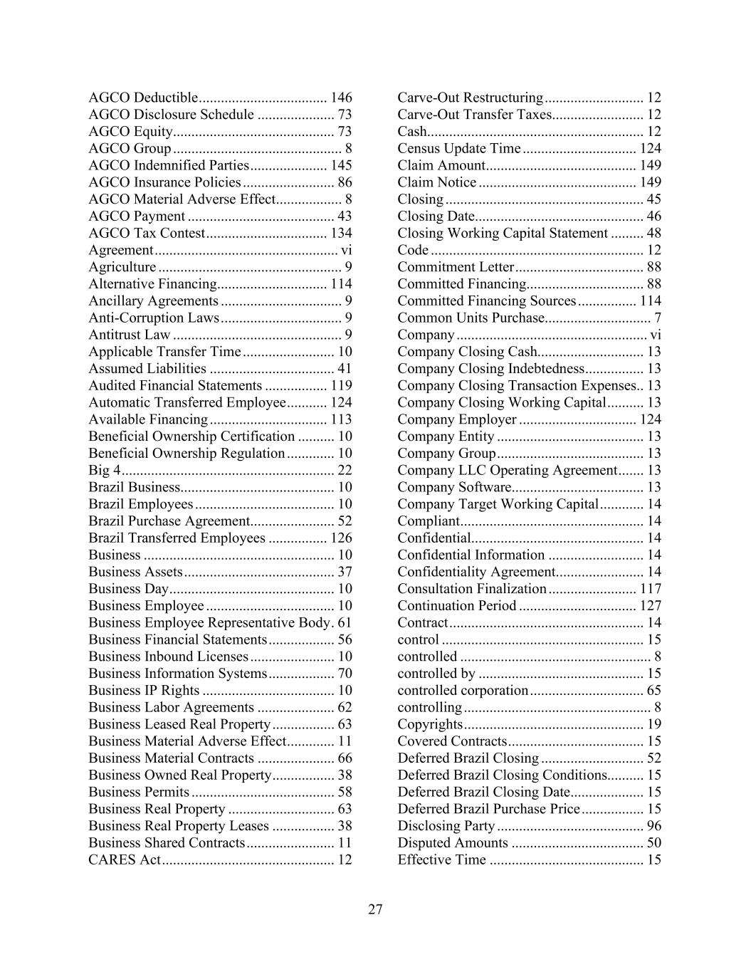 27 AGCO Deductible ................................... 146 AGCO Disclosure Schedule ..................... 73 AGCO Equity............................................ 73 AGCO Group .............................................. 8 AGCO Indemnified Parties ..................... 145 AGCO Insurance Policies ......................... 86 AGCO Material Adverse Effect .................. 8 AGCO Payment ........................................ 43 AGCO Tax Contest ................................. 134 Agreement .................................................. vi Agriculture .................................................. 9 Alternative Financing.............................. 114 Ancillary Agreements ................................. 9 Anti-Corruption Laws ................................. 9 Antitrust Law .............................................. 9 Applicable Transfer Time ......................... 10 Assumed Liabilities .................................. 41 Audited Financial Statements ................. 119 Automatic Transferred Employee ........... 124 Available Financing ................................ 113 Beneficial Ownership Certification .......... 10 Beneficial Ownership Regulation ............. 10 Big 4 .......................................................... 22 Brazil Business.......................................... 10 Brazil Employees ...................................... 10 Brazil Purchase Agreement....................... 52 Brazil Transferred Employees ................ 126 Business .................................................... 10 Business Assets ......................................... 37 Business Day ............................................. 10 Business Employee ................................... 10 Business Employee Representative Body . 61 Business Financial Statements .................. 56 Business Inbound Licenses ....................... 10 Business Information Systems .................. 70 Business IP Rights .................................... 10 Business Labor Agreements ..................... 62 Business Leased Real Property ................. 63 Business Material Adverse Effect ............. 11 Business Material Contracts ..................... 66 Business Owned Real Property ................. 38 Business Permits ....................................... 58 Business Real Property ............................. 63 Business Real Property Leases ................. 38 Business Shared Contracts ........................ 11 CARES Act ............................................... 12 Carve-Out Restructuring ........................... 12 Carve-Out Transfer Taxes......................... 12 Cash........................................................... 12 Census Update Time ............................... 124 Claim Amount ......................................... 149 Claim Notice ........................................... 149 Closing ...................................................... 45 Closing Date.............................................. 46 Closing Working Capital Statement ......... 48 Code .......................................................... 12 Commitment Letter ................................... 88 Committed Financing................................ 88 Committed Financing Sources ................ 114 Common Units Purchase............................. 7 Company .................................................... vi Company Closing Cash............................. 13 Company Closing Indebtedness ................ 13 Company Closing Transaction Expenses.. 13 Company Closing Working Capital .......... 13 Company Employer ................................ 124 Company Entity ........................................ 13 Company Group ........................................ 13 Company LLC Operating Agreement ....... 13 Company Software.................................... 13 Company Target Working Capital ............ 14 Compliant .................................................. 14 Confidential............................................... 14 Confidential Information .......................... 14 Confidentiality Agreement........................ 14 Consultation Finalization ........................ 117 Continuation Period ................................ 127 Contract ..................................................... 14 control ....................................................... 15 controlled .................................................... 8 controlled by ............................................. 15 controlled corporation ............................... 65 controlling ................................................... 8 Copyrights ................................................. 19 Covered Contracts ..................................... 15 Deferred Brazil Closing ............................ 52 Deferred Brazil Closing Conditions.......... 15 Deferred Brazil Closing Date.................... 15 Deferred Brazil Purchase Price ................. 15 Disclosing Party ........................................ 96 Disputed Amounts .................................... 50 Effective Time .......................................... 15