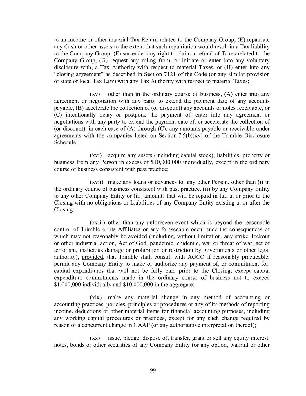 99 to an income or other material Tax Return related to the Company Group, (E) repatriate any Cash or other assets to the extent that such repatriation would result in a Tax liability to the Company Group, (F) surrender any right to claim a refund of Taxes related to the Company Group, (G) request any ruling from, or initiate or enter into any voluntary disclosure with, a Tax Authority with respect to material Taxes, or (H) enter into any “closing agreement” as described in Section 7121 of the Code (or any similar provision of state or local Tax Law) with any Tax Authority with respect to material Taxes; (xv) other than in the ordinary course of business, (A) enter into any agreement or negotiation with any party to extend the payment date of any accounts payable, (B) accelerate the collection of (or discount) any accounts or notes receivable, or (C) intentionally delay or postpone the payment of, enter into any agreement or negotiations with any party to extend the payment date of, or accelerate the collection of (or discount), in each case of (A) through (C), any amounts payable or receivable under agreements with the companies listed on Section 7.5(b)(xv) of the Trimble Disclosure Schedule; (xvi) acquire any assets (including capital stock), liabilities, property or business from any Person in excess of $10,000,000 individually, except in the ordinary course of business consistent with past practice; (xvii) make any loans or advances to, any other Person, other than (i) in the ordinary course of business consistent with past practice, (ii) by any Company Entity to any other Company Entity or (iii) amounts that will be repaid in full at or prior to the Closing with no obligations or Liabilities of any Company Entity existing at or after the Closing; (xviii) other than any unforeseen event which is beyond the reasonable control of Trimble or its Affiliates or any foreseeable occurrence the consequences of which may not reasonably be avoided (including, without limitation, any strike, lockout or other industrial action, Act of God, pandemic, epidemic, war or threat of war, act of terrorism, malicious damage or prohibition or restriction by governments or other legal authority), provided, that Trimble shall consult with AGCO if reasonably practicable, permit any Company Entity to make or authorize any payment of, or commitment for, capital expenditures that will not be fully paid prior to the Closing, except capital expenditure commitments made in the ordinary course of business not to exceed $1,000,000 individually and $10,000,000 in the aggregate; (xix) make any material change in any method of accounting or accounting practices, policies, principles or procedures or any of its methods of reporting income, deductions or other material items for financial accounting purposes, including any working capital procedures or practices, except for any such change required by reason of a concurrent change in GAAP (or any authoritative interpretation thereof); (xx) issue, pledge, dispose of, transfer, grant or sell any equity interest, notes, bonds or other securities of any Company Entity (or any option, warrant or other