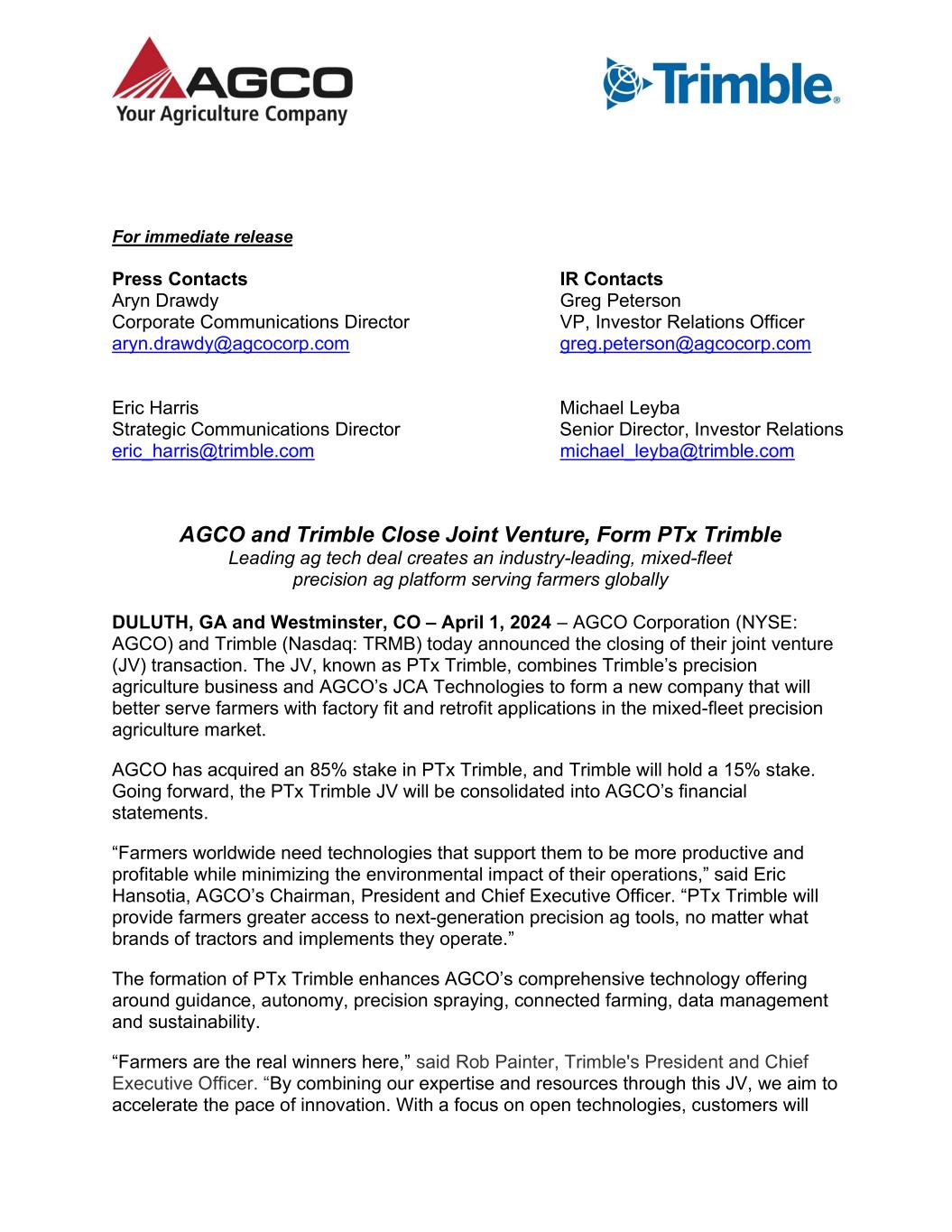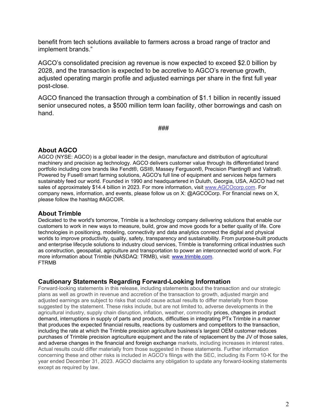 1 AMENDED AND RESTATED SALE AND CONTRIBUTION AGREEMENT This AMENDED AND RESTATED SALE AND CONTRIBUTION AGREEMENT, dated as of March 31, 2024 (this “Agreement”) and effective as of September 28, 2023, is by and among PTx Trimble LLC, (f/k/a Trimble Solutions, LLC), a Delaware limited liability company (the “Company”), Trimble Inc., a Delaware corporation (“Trimble”), and AGCO Corporation, a Delaware corporation (“AGCO”) (each of the Company, Trimble and AGCO, a “Party”, and collectively, the “Parties”). RECITALS WHEREAS, the Parties entered into that certain Sale and Contribution Agreement dated as of September 28, 2023 (the “Original Agreement”); WHEREAS, the Parties desire to amend and restate the Original Agreement; WHEREAS, this Agreement replaces the Original Agreement, which is hereby amended and restated in its entirety, effective on and as of September 28, 2023, and for the avoidance of doubt, the Parties are not making any representations or warranties as of March 31, 2024; WHEREAS, this Agreement shall not waive any rights that may have accrued to a Party resulting from any potential breach of the Original Agreement prior to the date of this Agreement; WHEREAS, on September 25, 2023, Trimble formed the Company pursuant to a Certificate of Formation filed with the Secretary of State of the State of Delaware; WHEREAS, as of the date hereof, Trimble directly owns 100% of the issued and outstanding equity ownership interests of the Company (the “Common Units”); WHEREAS, prior to the Effective Time, Trimble and the Company shall effect, or cause to be effected, the Carve-Out Restructuring (subject to Section 2.9); WHEREAS, the Excluded French Assets are subject to the French put option letter (the “French Put Option Letter”), executed as of September 28, 2023, by and among Trimble, AGCO and the Company, pursuant to which Trimble has been granted the option to transfer the Excluded French Assets in accordance with and subject to the terms and conditions of the Original Agreement and the French Transfer Agreements; WHEREAS, notwithstanding anything to the contrary contained in this Agreement, (i) the Parties expressly agree and acknowledge that with respect to the Excluded French Assets, Trimble may in its absolute discretion decide whether or not to exercise the put option granted by AGCO pursuant to the French Put Option Letter, and (ii) as of September 28, 2023, none of Trimble or any of its Affiliates is bound to sell or transfer or procure the sale or transfer of, the Excluded French Assets;