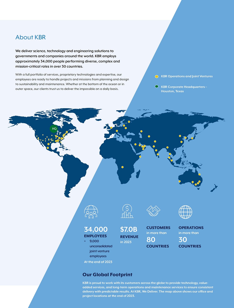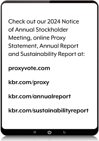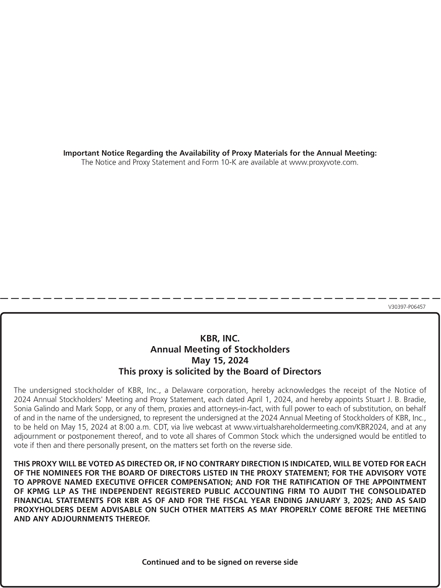 The accompanying proxy is solicited by the Board of Directors of KBR, Inc. By executing and returning the enclosed proxy or by following the online or telephone voting instructions, you authorize the individuals named in the proxy to represent you and vote your shares on the matters described in the Notice of Annual Meeting of Stockholders. Your proxy will be effective for the May 15, 2024, meeting and at any adjournment or postponement of that meeting.