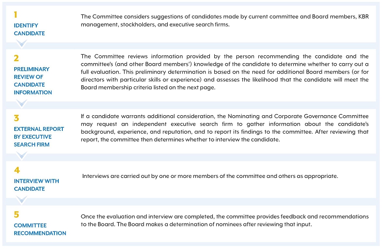 For stockholder proposals or director nominations to have been properly submitted for presentation at our upcoming annual meeting, we must have received notice of the proposal or nomination within the time periods set forth under Article II, Section 9 of our Bylaws. Any such proposals and nominations must comply with Article II, Section 9 of our Bylaws. We will disregard any proposal or nomination that does not comply with these requirements. Even if you comply with these requirements, KBR is not obligated to include the proposed business or nominee in our proxy solicitation materials unless required to do so under applicable law, SEC rules and regulations, or pursuant to our Bylaws.