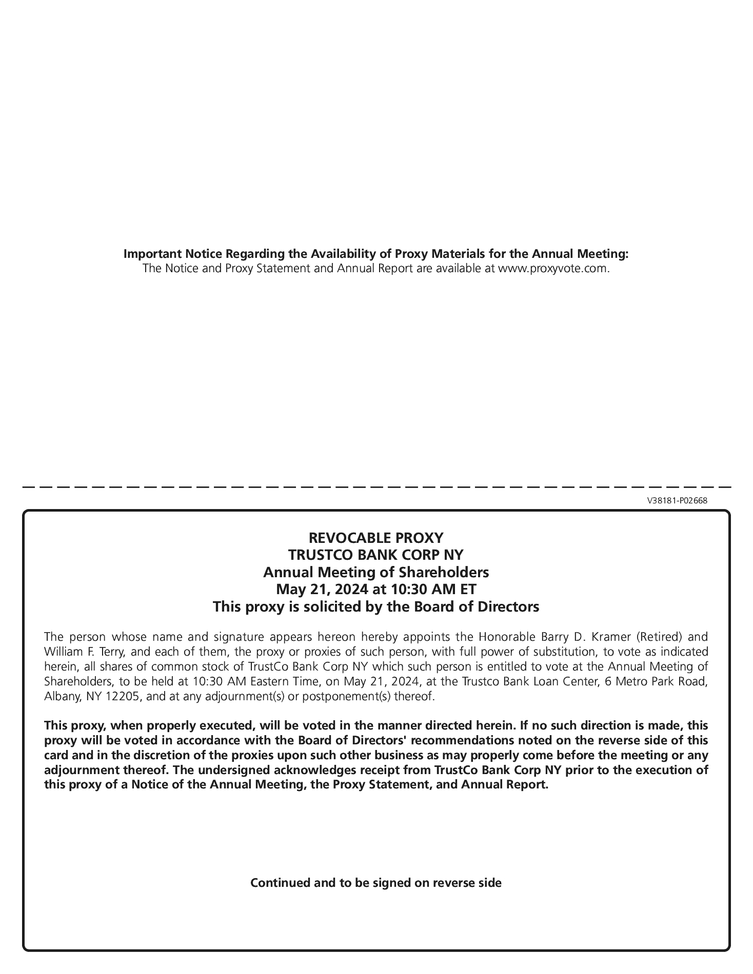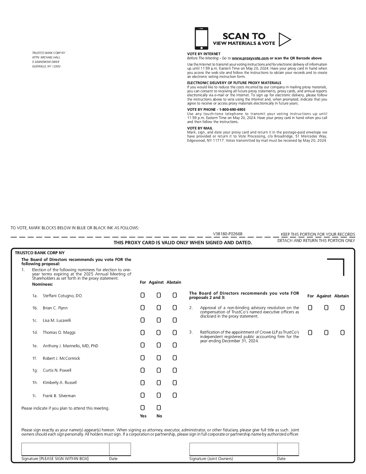 Upon the recommendation of the disinterested members of the Nominating and Corporate Governance Committee, Ms. Lucarelli was elected as Lead Independent Director effective March 19, 2024 to serve a term ending upon the earlier of March 31, 2025 or the date the board elects a successor. Robert J. McCormick, TrustCo’s president and chief executive officer, continues to serve as the chairman of the board.