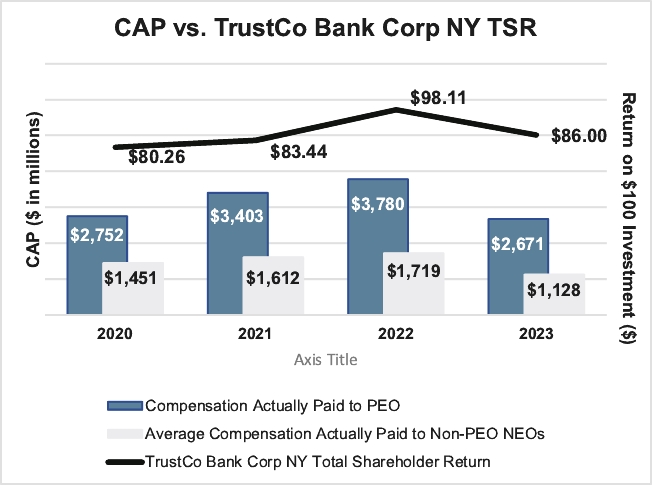 TrustCo’s Compensation Committee held 9 meetings in 2023. The directors currently serving on the Compensation Committee are Thomas O. Maggs (Chair), Dr. Steffani Cotugno, Brian C. Flynn, Lisa M. Lucarelli, Dr. Anthony J. Marinello, Curtis N. Powell, Kimberly A. Russell, and Frank B. Silverman. The function of the Compensation Committee is to generally oversee the employee compensation and benefit policies, plans, and programs of TrustCo and Trustco Bank. The Compensation Committee’s responsibilities also include establishing, annually reviewing, and approving the compensation of the executive officers. In addition, the Compensation Committee is responsible for annually reviewing board compensation and making appropriate recommendations for changes thereto. The Compensation Committee may, in its discretion and subject to the requirements of applicable law, delegate all or a portion of its duties and responsibilities to a subcommittee of the committee. Please refer to the discussion under “Executive Compensation” for a more detailed description of the Compensation Committee’s activities relative to the named executive officers.