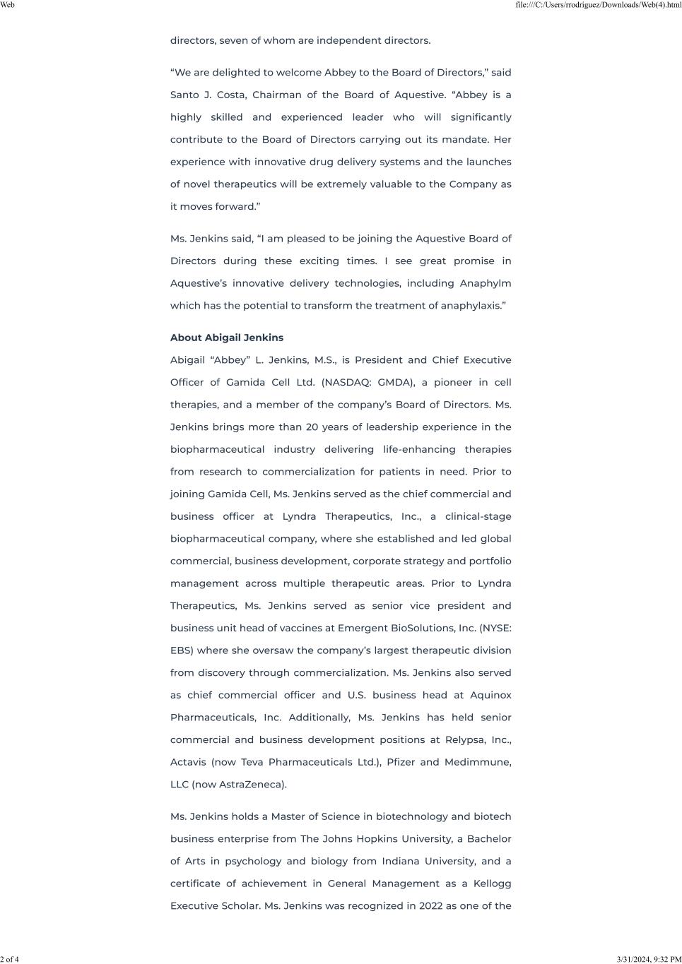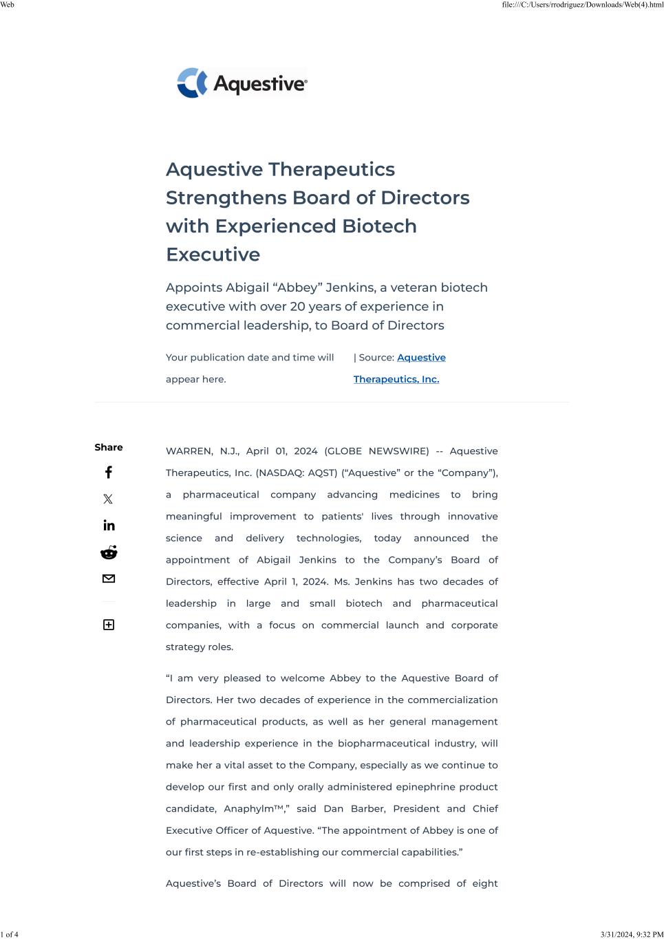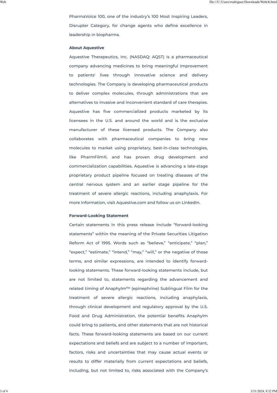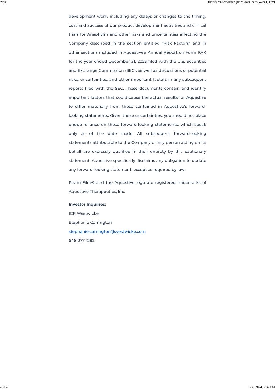 Dated: April 1, 2024 | Aquestive Therapeutics, Inc. |