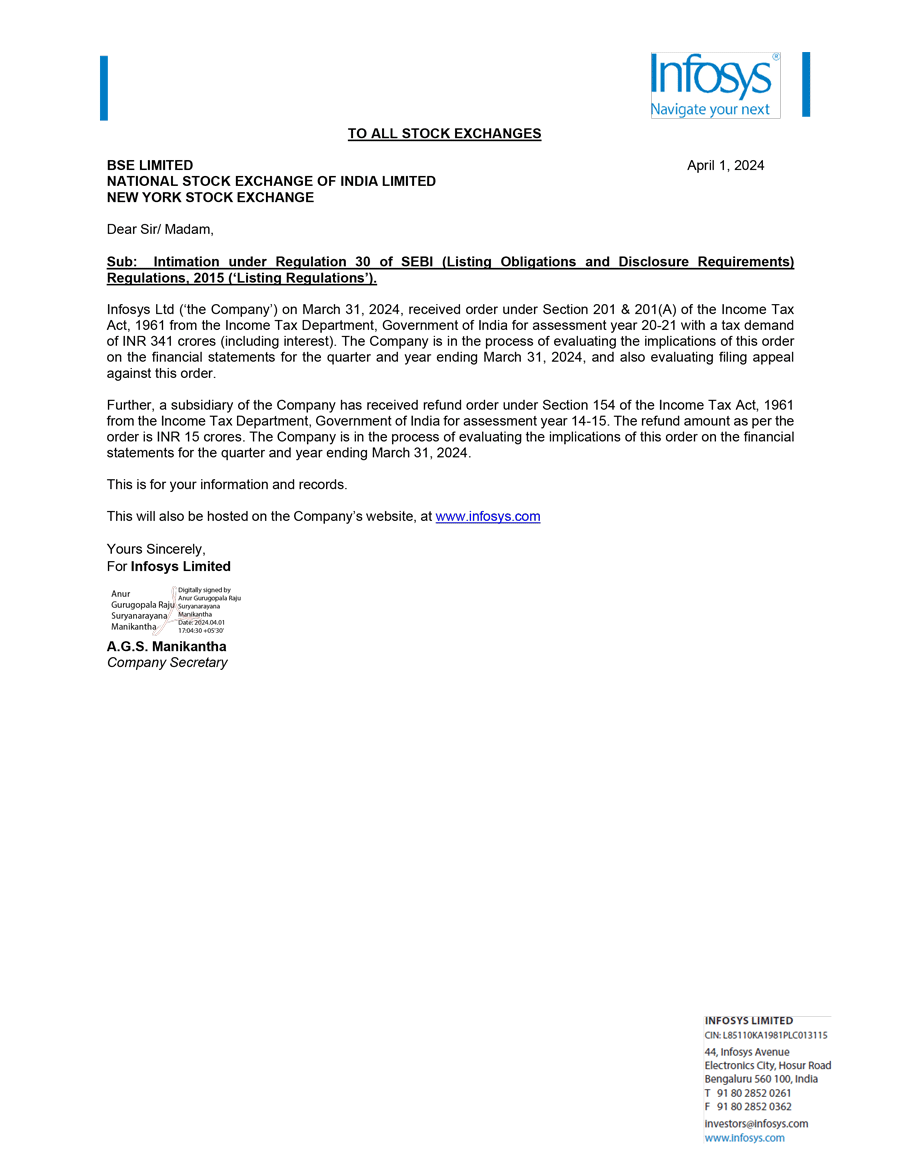 Infosys Limited, a company organized under the laws of the Republic of India ("Infosys", or the "Company"), hereby furnishes with the United States Securities and Exchange Commission this Report on Form 6-K regarding the intimation dated March 30, 2024 and April 1, 2024, pertaining to an update that it has received refund orders/ demand orders from the Income Tax Department, Government of India. The Company is in the process of evaluating the implications of these orders on the financial statements for the quarter and year ending March 31, 2024, and evaluating filing appeals against demand orders, wherever necessary.