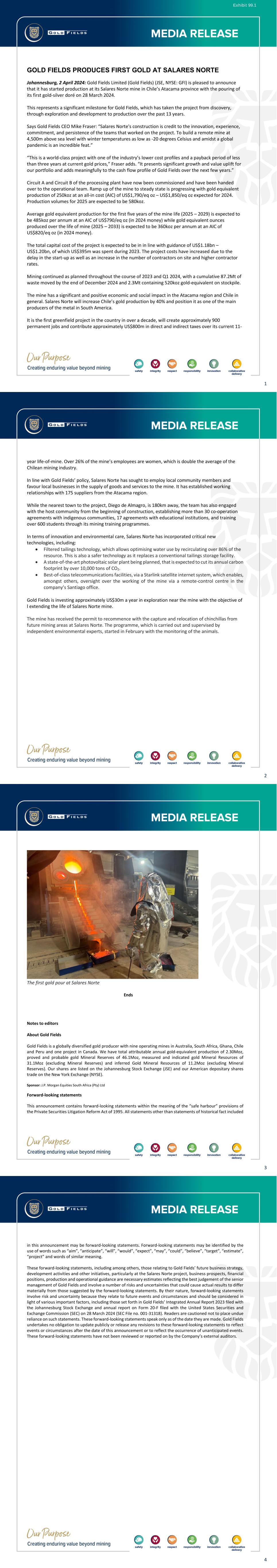 1 GOLD FIELDS PRODUCES FIRST GOLD AT SALARES NORTE Johannesburg, 2 April 2024: Gold Fields Limited (Gold Fields) (JSE, NYSE: GFI) is pleased to announce that it has started production at its Salares Norte mine in Chile’s Atacama province with the pouring of its first gold-silver doré on 28 March 2024. This represents a significant milestone for Gold Fields, which has taken the project from discovery, through exploration and development to production over the past 13 years. Says Gold Fields CEO Mike Fraser: “Salares Norte's construction is credit to the innovation, experience, commitment, and persistence of the teams that worked on the project. To build a remote mine at 4,500m above sea level with winter temperatures as low as -20 degrees Celsius and amidst a global pandemic is an incredible feat.” “This is a world-class project with one of the industry’s lower cost profiles and a payback period of less than three years at current gold prices,” Fraser adds. “It presents significant growth and value uplift for our portfolio and adds meaningfully to the cash flow profile of Gold Fields over the next few years.” Circuit A and Circuit B of the processing plant have now been commissioned and have been handed over to the operational team. Ramp up of the mine to steady state is progressing with gold equivalent production of 250koz at an all-in cost (AIC) of US$1,790/eq oz – US$1,850/eq oz expected for 2024. Production volumes for 2025 are expected to be 580koz. Average gold equivalent production for the first five years of the mine life (2025 – 2029) is expected to be 485koz per annum at an AIC of US$790/eq oz (in 2024 money) while gold equivalent ounces produced over the life of mine (2025 – 2033) is expected to be 360koz per annum at an AIC of US$820/eq oz (in 2024 money). The total capital cost of the project is expected to be in in line with guidance of US$1.18bn – US$1.20bn, of which US$395m was spent during 2023. The project costs have increased due to the delay in the start-up as well as an increase in the number of contractors on site and higher contractor rates. Mining continued as planned throughout the course of 2023 and Q1 2024, with a cumulative 87.2Mt of waste moved by the end of December 2024 and 2.3Mt containing 520koz gold-equivalent on stockpile. The mine has a significant and positive economic and social impact in the Atacama region and Chile in general. Salares Norte will increase Chile’s gold production by 40% and position it as one of the main producers of the metal in South America. It is the first greenfield project in the country in over a decade, will create approximately 900 permanent jobs and contribute approximately US$800m in direct and indirect taxes over its current 11- 2 year life-of-mine. Over 26% of the mine’s employees are women, which is double the average of the Chilean mining industry. In line with Gold Fields’ policy, Salares Norte has sought to employ local community members and favour local businesses in the supply of goods and services to the mine. It has established working relationships with 175 suppliers from the Atacama region. While the nearest town to the project, Diego de Almagro, is 180km away, the team has also engaged with the host community from the beginning of construction, establishing more than 30 co-operation agreements with indigenous communities, 17 agreements with educational institutions, and training over 600 students through its mining training programmes. In terms of innovation and environmental care, Salares Norte has incorporated critical new technologies, including:  Filtered tailings technology, which allows optimising water use by recirculating over 86% of the resource. This is also a safer technology as it replaces a conventional tailings storage facility.  A state-of-the-art photovoltaic solar plant being planned, that is expected to cut its annual carbon footprint by over 10,000 tons of CO2.  Best-of-class telecommunications facilities, via a Starlink satellite internet system, which enables, amongst others, oversight over the working of the mine via a remote-control centre in the company’s Santiago office. Gold Fields is investing approximately US$30m a year in exploration near the mine with the objective of l extending the life of Salares Norte mine. The mine has received the permit to recommence with the capture and relocation of chinchillas from future mining areas at Salares Norte. The programme, which is carried out and supervised by independent environmental experts, started in February with the monitoring of the animals. 3 The first gold pour at Salares Norte Ends Notes to editors About Gold Fields Gold Fields is a globally diversified gold producer with nine operating mines in Australia, South Africa, Ghana, Chile and Peru and one project in Canada. We have total attributable annual gold-equivalent production of 2.30Moz, proved and probable gold Mineral Reserves of 46.1Moz, measured and indicated gold Mineral Resources of 31.1Moz (excluding Mineral Reserves) and inferred Gold Mineral Resources of 11.2Moz (excluding Mineral Reserves). Our shares are listed on the Johannesburg Stock Exchange (JSE) and our American depositary shares trade on the New York Exchange (NYSE). Sponsor: J.P. Morgan Equities South Africa (Pty) Ltd Forward-looking statements This announcement contains forward-looking statements within the meaning of the “safe harbour” provisions of the Private Securities Litigation Reform Act of 1995. All statements other than statements of historical fact included 4 in this announcement may be forward-looking statements. Forward-looking statements may be identified by the use of words such as “aim”, “anticipate”, “will”, “would”, “expect”, “may”, “could”, “believe”, “target”, “estimate”, “project” and words of similar meaning. These forward-looking statements, including among others, those relating to Gold Fields’ fut