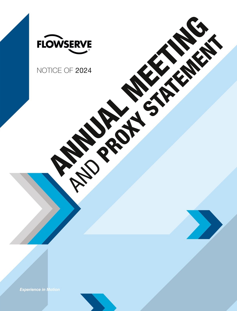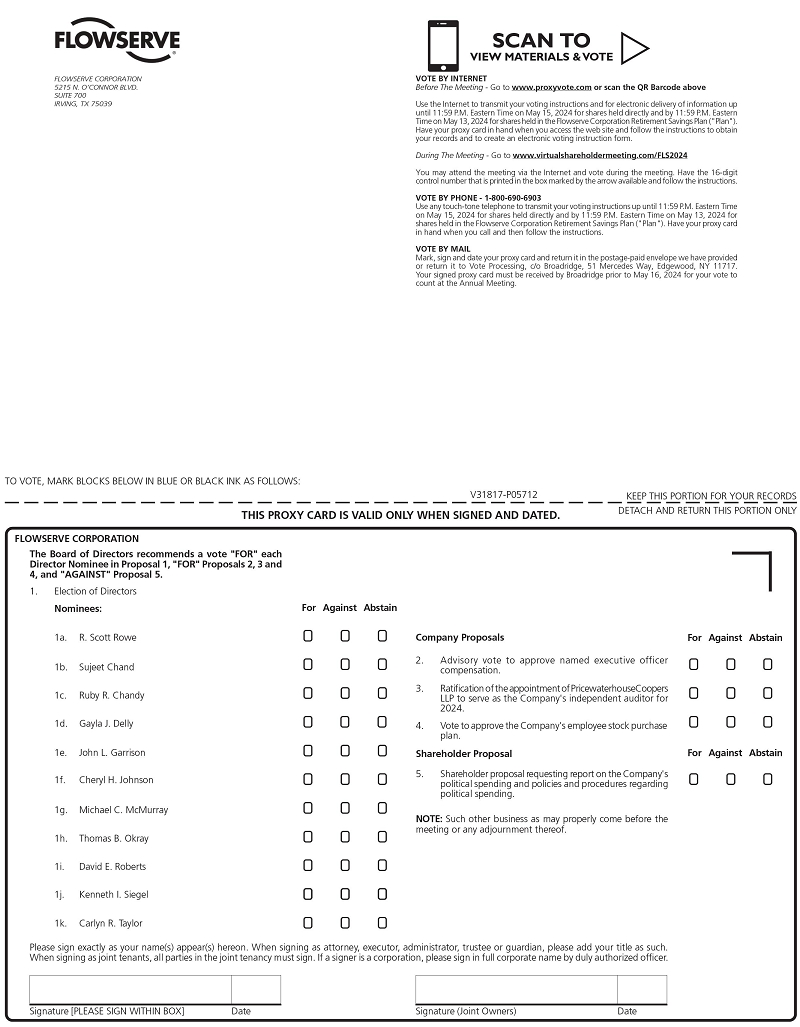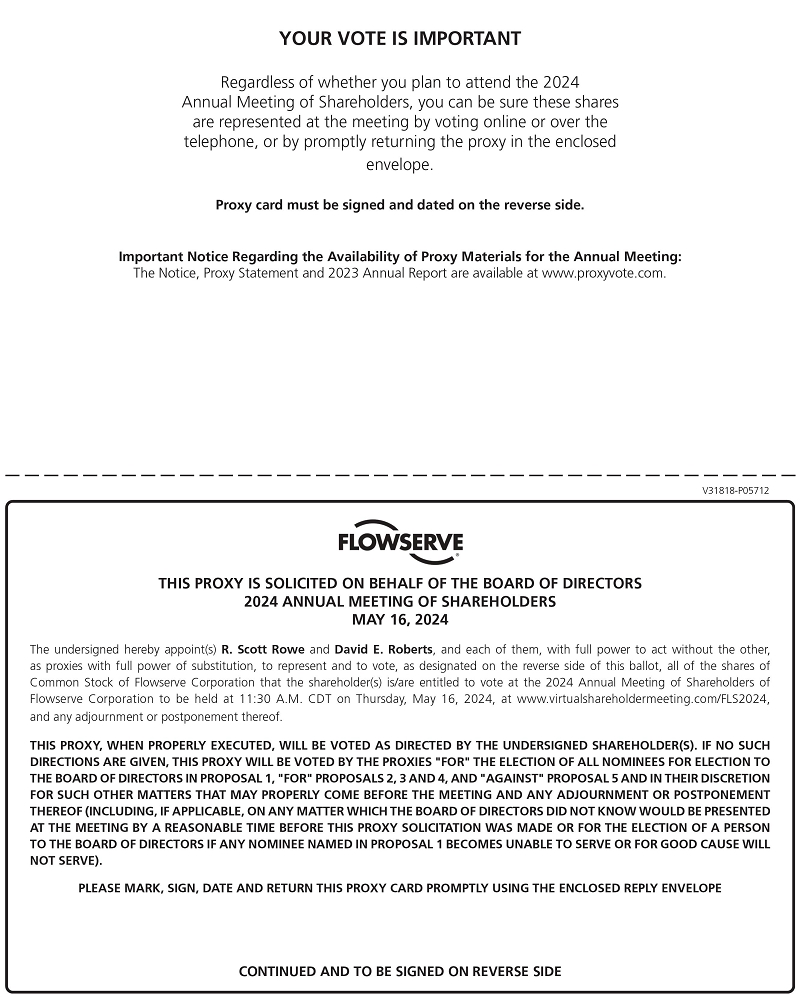 We are pleased to invite you to join our Board of Directors and senior leadership at Flowserve’s 2024 Annual Meeting of Shareholders (the “Annual Meeting”). The Annual Meeting will be held online only and will begin at 11:30 a.m. CDT on May 16, 2024. We will hold the Annual Meeting solely by means of remote communications with no in-person location. You can attend the Annual Meeting and vote online at https://www.virtualshareholdermeeting.com/FLS2024.