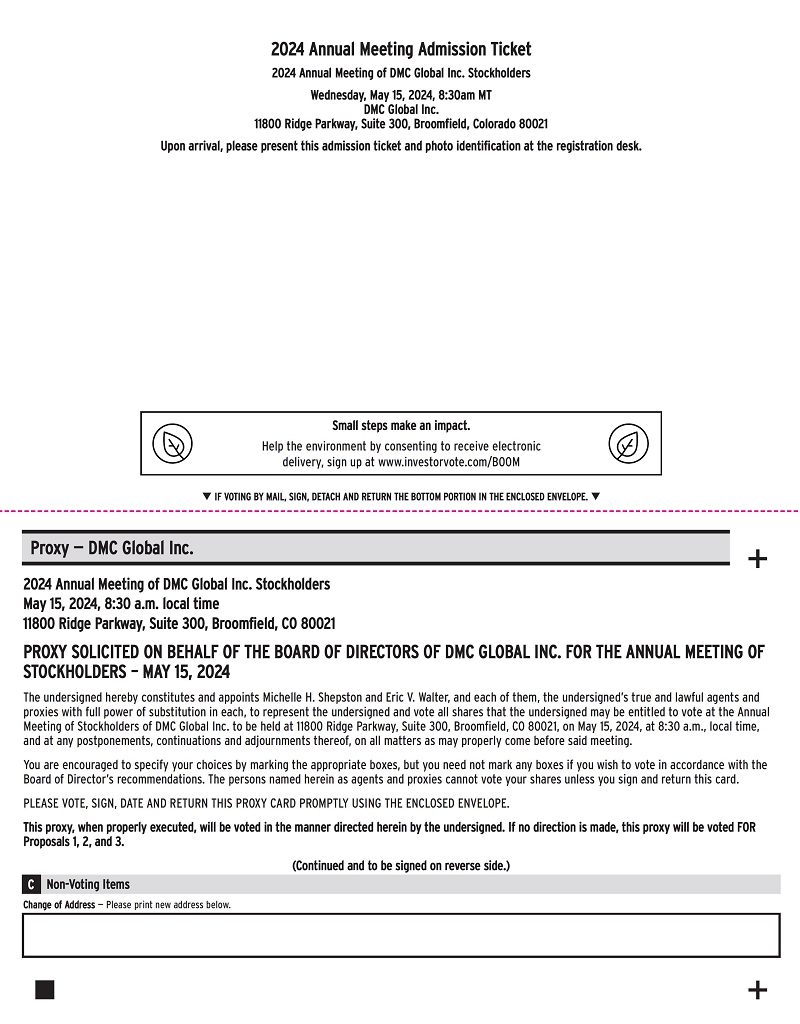 NOTICE IS HEREBY GIVEN that the Annual Meeting of Stockholders of DMC Global Inc., a Delaware corporation, will be held on May 15, 2024, at 8:30 a.m. local time at 11800 Ridge Parkway, Suite 300, Broomfield, Colorado 80021, for the following purposes: