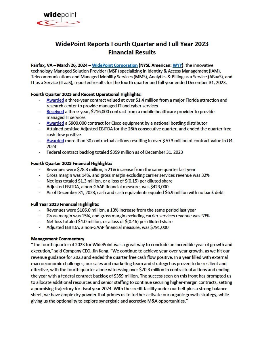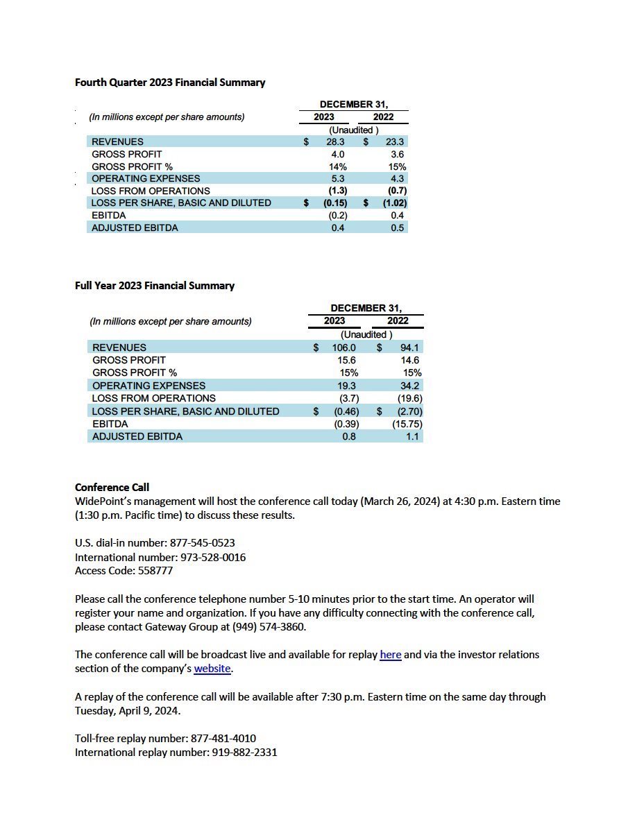 On March 26, 2024, WidePoint Corporation (the “Company”) conducted a conference call to discuss its financial results for the year ended December 31, 2023. A copy of the transcript of such conference call is furnished herewith as Exhibit 99.1 to this Current Report on Form 8-K. In addition, on March 26, 2024, the Company issued a press release announcing its financial results for the year ended December 31, 2023, which press release is furnished herewith as Exhibit 99.2 to this Current Report on Form 8-K.