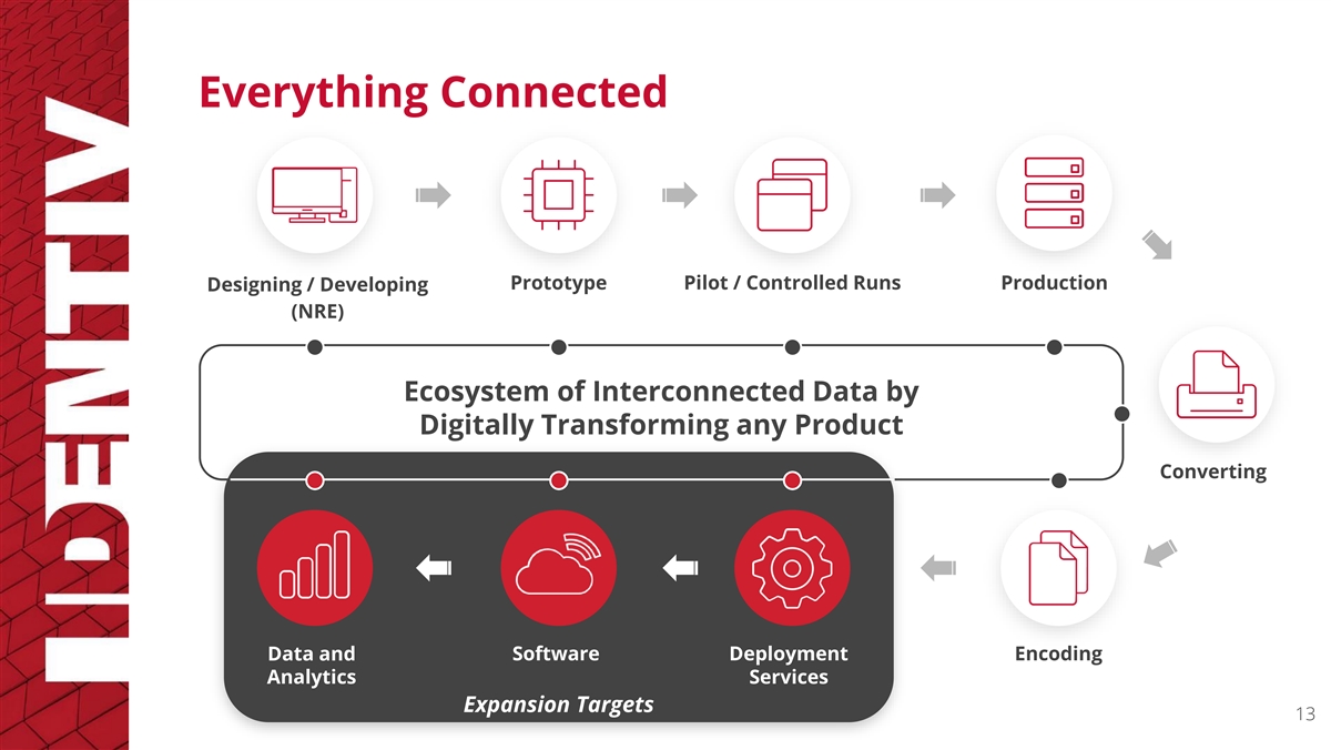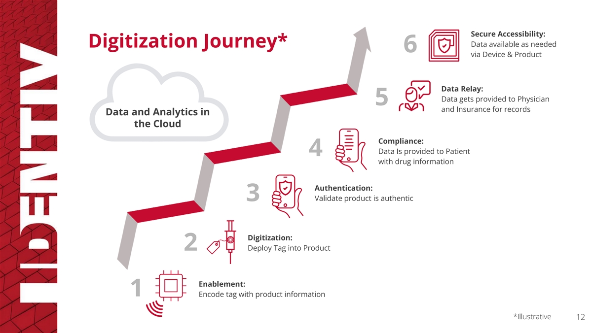 Secure Accessibility: Data available as needed Digitization Journey* 6 via Device & Product Data Relay: Data gets provided to Physician 5 and Insurance for records Data and Analytics in the Cloud Compliance: Data Is provided to Patient 4 with drug information Authentication: 3 Validate product is authentic Digitization: 2 Deploy Tag into Product Enablement: 1 Encode tag with product information *Illustrative 12