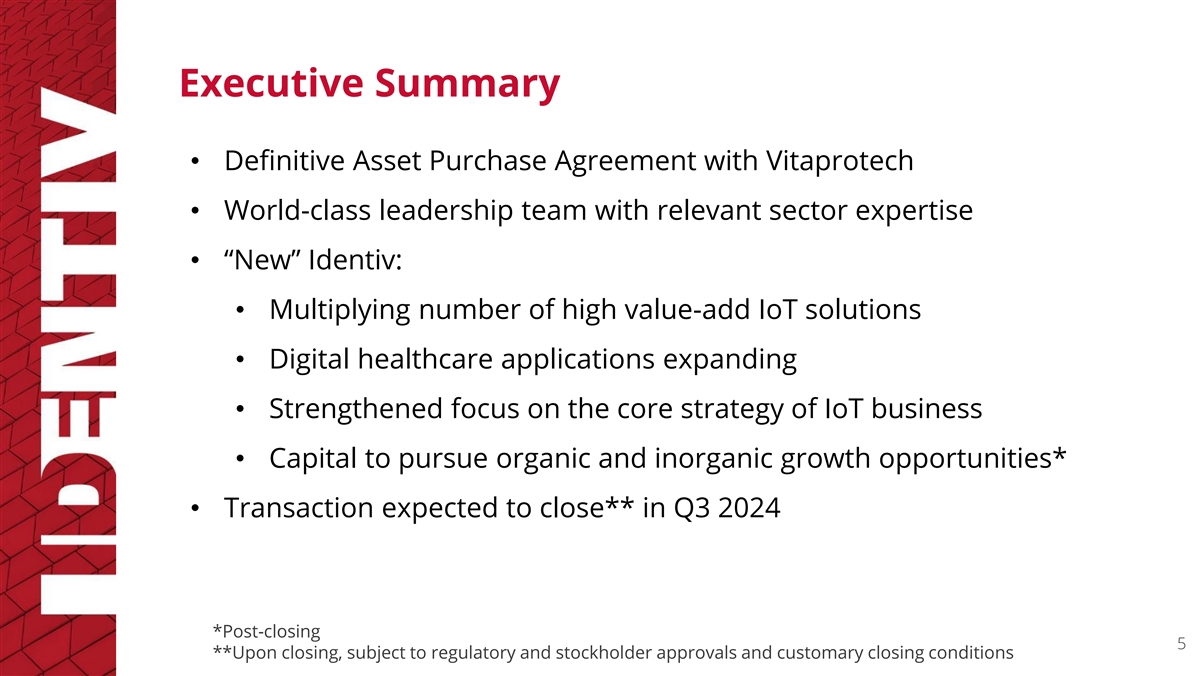 Safe Harbor Participants in the Solicitation, continued * The business address is 2201 Walnut Avenue, Suite 100, Fremont, California 94538. ^ Excludes Steven Humphreys,Identiv’s Chief Executive Officer, who is listed under“Certain Officers and Other Employees.” In addition, each of Bleichroeder LP and Bleichroeder Holdings LLC (together, “Bleichroeder”) is or may be deemed to be a “participant” in the solicitation of proxies from stockholders of Identiv in connection with the transactions contemplated by the agreement. Information about the ownership of securities of Bleichroeder is set forth in the section entitled “Security Ownership of Certain Beneficial Owners and Management” of the 2023 Proxy Statement and Amendment No. 1 to the Schedule 13D filed by Bleichroeder on October 23, 2023. Any further changes will be reflected in the section entitled “Security Ownership of Certain Beneficial Owners and Management” of Identiv’s definitive Proxy Statement, and other materials to be filed with the SEC. 4