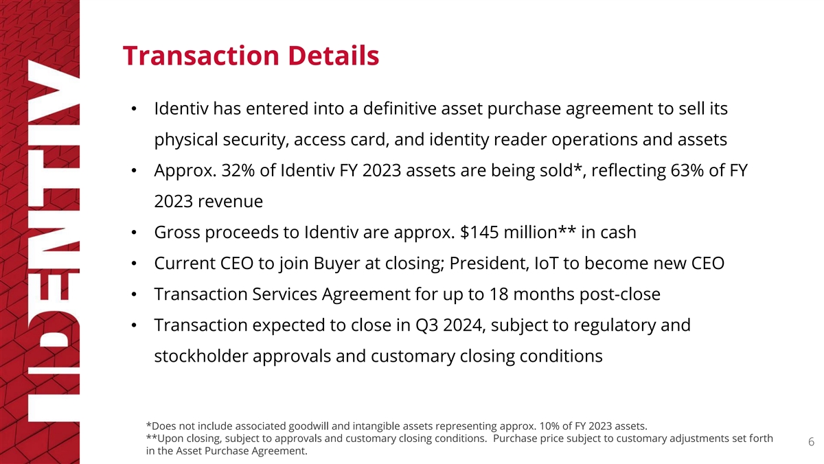 Executive Summary • Definitive Asset Purchase Agreement with Vitaprotech • World-class leadership team with relevant sector expertise • “New” Identiv: • Multiplying number of high value-add IoT solutions • Digital healthcare applications expanding • Strengthened focus on the core strategy of IoT business • Capital to pursue organic and inorganic growth opportunities* • Transaction expected to close** in Q3 2024 *Post-closing 5 **Upon closing, subject to regulatory and stockholder approvals and customary closing conditions