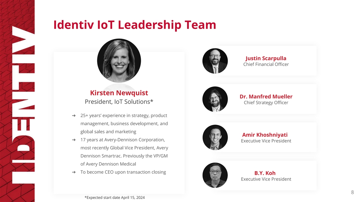 Aligned with this strategic direction, Identiv announced the appointment of Kirsten Newquist as President, IoT Solutions, effective April 15, 2024. Ms. Newquist is a seasoned business leader with over 25 years experience in strategy, product management, business development, and global sales and marketing. She will join Identiv after 17 years at Avery Dennison Corporation. She was most recently Global Vice President, Avery Dennison Smartrac, and previously held other leadership roles including the VP/GM of Avery Dennison Medical.