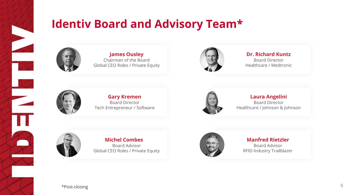 Identiv IoT Leadership Team Justin Scarpulla Chief Financial Officer Kirsten Newquist Dr. Manfred Mueller President, IoT Solutions* Chief Strategy Officer ➔ 25+ years’ experience in strategy, product management, business development, and global sales and marketing Amir Khoshniyati ➔ 17 years at Avery-Dennison Corporation, Executive Vice President most recently Global Vice President, Avery Dennison Smartrac. Previously the VP/GM of Avery Dennison Medical ➔ To become CEO upon transaction closing B.Y. Koh Executive Vice President 8 *Expected start date April 15, 2024