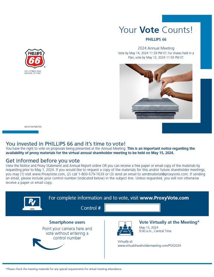 Plan, vote by May 12, 2024 11:59 PM ET. V41019-P06735 You invested in PHILLIPS 66 and it’s time to vote! You have the right to vote on proposals being presented at the Annual Meeting. This is an important notice regarding the availability of proxy materials for the virtual annual shareholder meeting to be held on May 15, 2024. Get informed before you vote View the Notice and Proxy Statement and Annual Report online OR you can receive a free paper or email copy of th materials by requesting prior to May 1, 2024. If you would like to request a copy of the