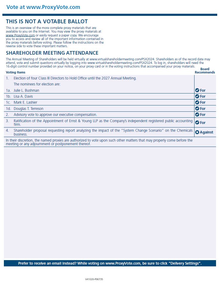 ATTENDANCE The Annual Meeting of Shareholders will be held virtually at www.virtualshareholdermeeting.com/PSX2024. Shareholders as of the record date may attend, vote and