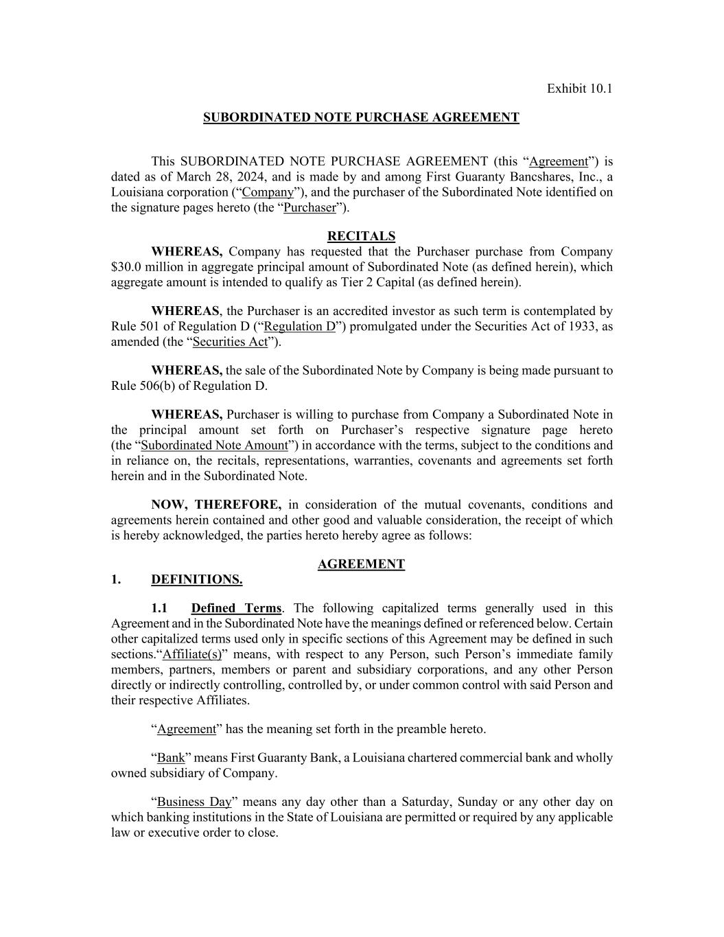 Exhibit 10.1 SUBORDINATED NOTE PURCHASE AGREEMENT This SUBORDINATED NOTE PURCHASE AGREEMENT (this “Agreement”) is dated as of March 28, 2024, and is made by and among First Guaranty Bancshares, Inc., a Louisiana corporation (“Company”), and the purchaser of the Subordinated Note identified on the signature pages hereto (the “Purchaser”). RECITALS WHEREAS, Company has requested that the Purchaser purchase from Company $30.0 million in aggregate principal amount of Subordinated Note (as defined herein), which aggregate amount is intended to qualify as Tier 2 Capital (as defined herein). WHEREAS, the Purchaser is an accredited investor as such term is contemplated by Rule 501 of Regulation D (“Regulation D”) promulgated under the Securities Act of 1933, as amended (the “Securities Act”). WHEREAS, the sale of the Subordinated Note by Company is being made pursuant to Rule 506(b) of Regulation D. WHEREAS, Purchaser is willing to purchase from Company a Subordinated Note in the principal amount set forth on Purchaser’s respective signature page hereto (the “Subordinated Note Amount”) in accordance with the terms, subject to the conditions and in reliance on, the recitals, representations, warranties, covenants and agreements set forth herein and in the Subordinated Note. NOW, THEREFORE, in consideration of the mutual covenants, conditions and agreements herein contained and other good and valuable consideration, the receipt of which is hereby acknowledged, the parties hereto hereby agree as follows: AGREEMENT 1. DEFINITIONS. 1.1 Defined Terms. The following capitalized terms generally used in this Agreement and in the Subordinated Note have the meanings defined or referenced below. Certain other capitalized terms used only in specific sections of this Agreement may be defined in such sections.“Affiliate(s)” means, with respect to any Person, such Person’s immediate family members, partners, members or parent and subsidiary corporations, and any other Person directly or indirectly controlling, controlled by, or under common control with said Person and their respective Affiliates. “Agreement” has the meaning set forth in the preamble hereto. “Bank” means First Guaranty Bank, a Louisiana chartered commercial bank and wholly owned subsidiary of Company. “Business Day” means any day other than a Saturday, Sunday or any other day on which banking institutions in the State of Louisiana are permitted or required by any applicable law or executive order to close.