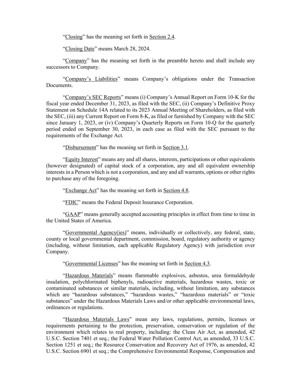 “Closing” has the meaning set forth in Section 2.4. “Closing Date” means March 28, 2024. “Company” has the meaning set forth in the preamble hereto and shall include any successors to Company. “Company’s Liabilities” means Company’s obligations under the Transaction Documents. “Company’s SEC Reports” means (i) Company’s Annual Report on Form 10-K for the fiscal year ended December 31, 2023, as filed with the SEC, (ii) Company’s Definitive Proxy Statement on Schedule 14A related to its 2023 Annual Meeting of Shareholders, as filed with the SEC, (iii) any Current Report on Form 8-K, as filed or furnished by Company with the SEC since January 1, 2023, or (iv) Company’s Quarterly Reports on Form 10-Q for the quarterly period ended on September 30, 2023, in each case as filed with the SEC pursuant to the requirements of the Exchange Act. “Disbursement” has the meaning set forth in Section 3.1. “Equity Interest” means any and all shares, interests, participations or other equivalents (however designated) of capital stock of a corporation, any and all equivalent ownership interests in a Person which is not a corporation, and any and all warrants, options or other rights to purchase any of the foregoing. “Exchange Act” has the meaning set forth in Section 4.8. “FDIC” means the Federal Deposit Insurance Corporation. “GAAP” means generally accepted accounting principles in effect from time to time in the United States of America. “Governmental Agency(ies)” means, individually or collectively, any federal, state, county or local governmental department, commission, board, regulatory authority or agency (including, without limitation, each applicable Regulatory Agency) with jurisdiction over Company. “Governmental Licenses” has the meaning set forth in Section 4.3. “Hazardous Materials” means flammable explosives, asbestos, urea formaldehyde insulation, polychlorinated biphenyls, radioactive materials, hazardous wastes, toxic or contaminated substances or similar materials, including, without limitation, any substances which are “hazardous substances,” “hazardous wastes,” “hazardous materials” or “toxic substances” under the Hazardous Materials Laws and/or other applicable environmental laws, ordinances or regulations. “Hazardous Materials Laws” mean any laws, regulations, permits, licenses or requirements pertaining to the protection, preservation, conservation or regulation of the environment which relates to real property, including: the Clean Air Act, as amended, 42 U.S.C. Section 7401 et seq.; the Federal Water Pollution Control Act, as amended, 33 U.S.C. Section 1251 et seq.; the Resource Conservation and Recovery Act of 1976, as amended, 42 U.S.C. Section 6901 et seq.; the Comprehensive Environmental Response, Compensation and