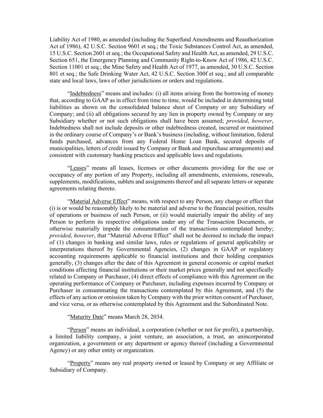 Liability Act of 1980, as amended (including the Superfund Amendments and Reauthorization Act of 1986), 42 U.S.C. Section 9601 et seq.; the Toxic Substances Control Act, as amended, 15 U.S.C. Section 2601 et seq.; the Occupational Safety and Health Act, as amended, 29 U.S.C. Section 651, the Emergency Planning and Community Right-to-Know Act of 1986, 42 U.S.C. Section 11001 et seq.; the Mine Safety and Health Act of 1977, as amended, 30 U.S.C. Section 801 et seq.; the Safe Drinking Water Act, 42 U.S.C. Section 300f et seq.; and all comparable state and local laws, laws of other jurisdictions or orders and regulations. “Indebtedness” means and includes: (i) all items arising from the borrowing of money that, according to GAAP as in effect from time to time, would be included in determining total liabilities as shown on the consolidated balance sheet of Company or any Subsidiary of Company; and (ii) all obligations secured by any lien in property owned by Company or any Subsidiary whether or not such obligations shall have been assumed; provided, however, Indebtedness shall not include deposits or other indebtedness created, incurred or maintained in the ordinary course of Company’s or Bank’s business (including, without limitation, federal funds purchased, advances from any Federal Home Loan Bank, secured deposits of municipalities, letters of credit issued by Company or Bank and repurchase arrangements) and consistent with customary banking practices and applicable laws and regulations. “Leases” means all leases, licenses or other documents providing for the use or occupancy of any portion of any Property, including all amendments, extensions, renewals, supplements, modifications, sublets and assignments thereof and all separate letters or separate agreements relating thereto. “Material Adverse Effect” means, with respect to any Person, any change or effect that (i) is or would be reasonably likely to be material and adverse to the financial position, results of operations or business of such Person, or (ii) would materially impair the ability of any Person to perform its respective obligations under any of the Transaction Documents, or otherwise materially impede the consummation of the transactions contemplated hereby; provided, however, that “Material Adverse Effect” shall not be deemed to include the impact of (1) changes in banking and similar laws, rules or regulations of general applicability or interpretations thereof by Governmental Agencies, (2) changes in GAAP or regulatory accounting requirements applicable to financial institutions and their holding companies generally, (3) changes after the date of this Agreement in general economic or capital market conditions affecting financial institutions or their market prices generally and not specifically related to Company or Purchaser, (4) direct effects of compliance with this Agreement on the operating performance of Company or Purchaser, including expenses incurred by Company or Purchaser in consummating the transactions contemplated by this Agreement, and (5) the effects of any action or omission taken by Company with the prior written consent of Purchaser, and vice versa, or as otherwise contemplated by this Agreement and the Subordinated Note. “Maturity Date” means March 28, 2034. “Person” means an individual, a corporation (whether or not for profit), a partnership, a limited liability company, a joint venture, an association, a trust, an unincorporated organization, a government or any department or agency thereof (including a Governmental Agency) or any other entity or organization. “Property” means any real property owned or leased by Company or any Affiliate or Subsidiary of Company.