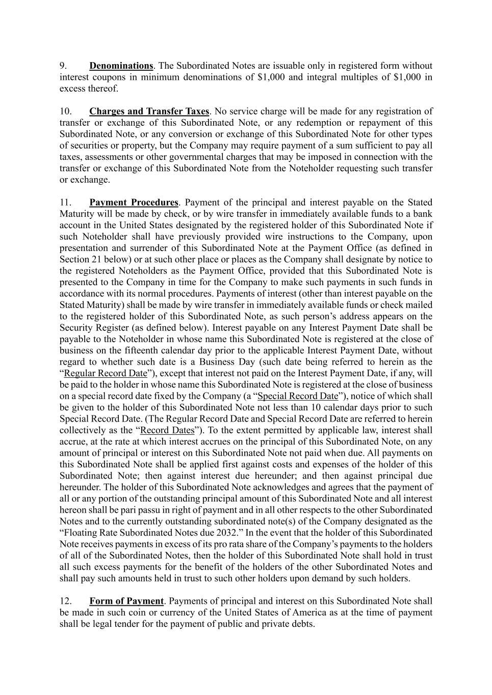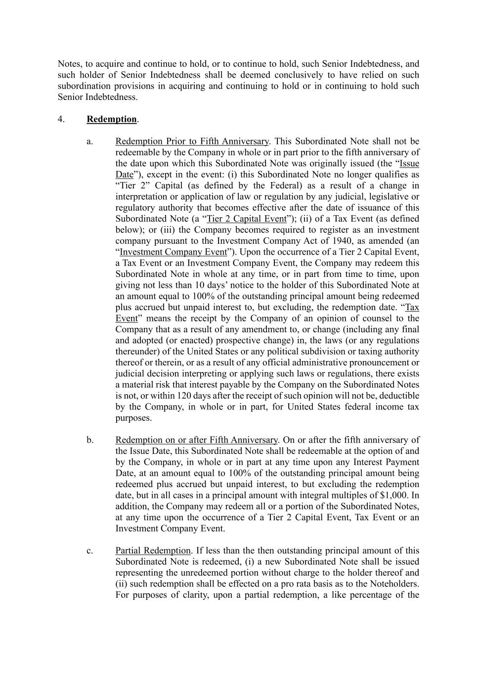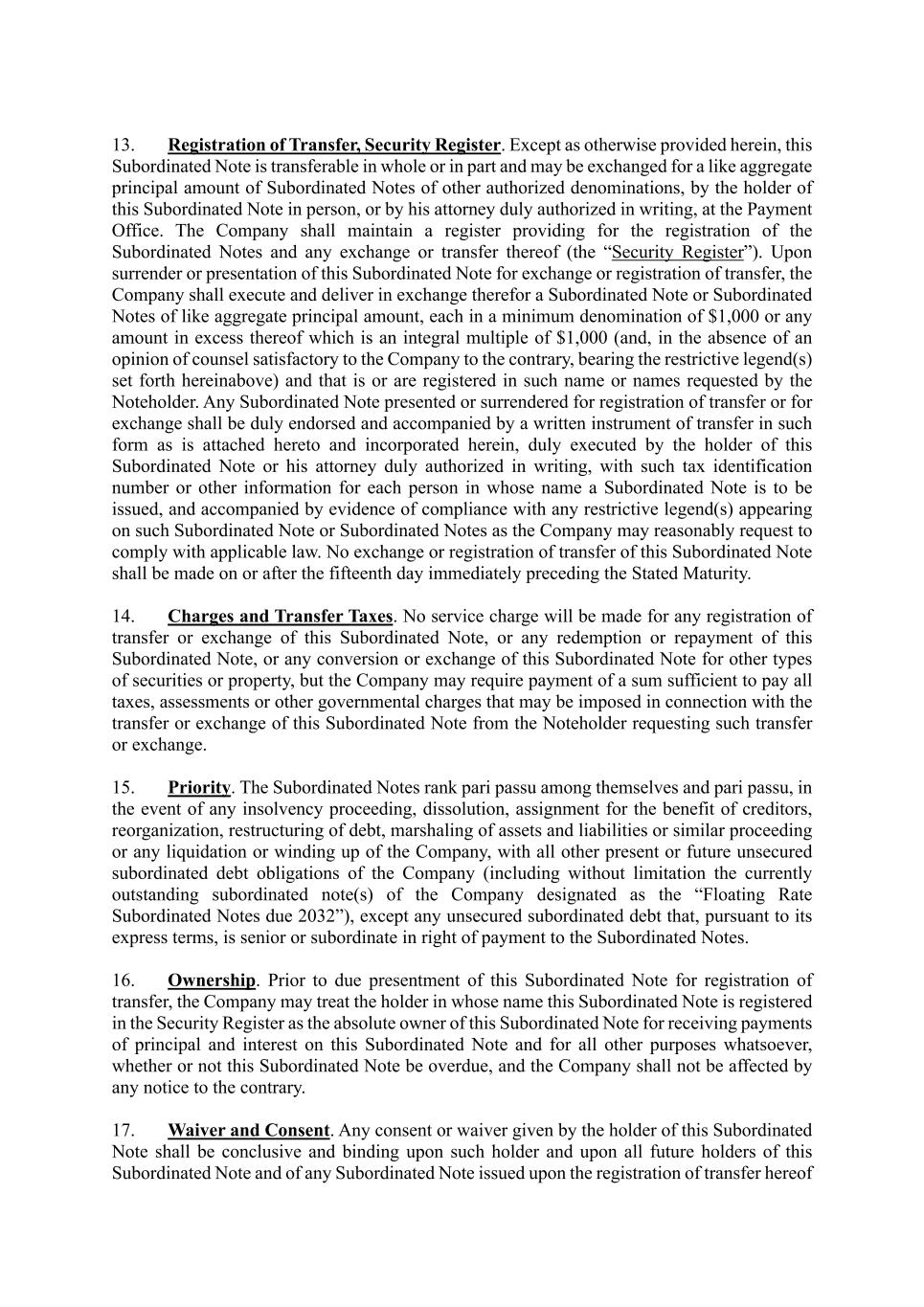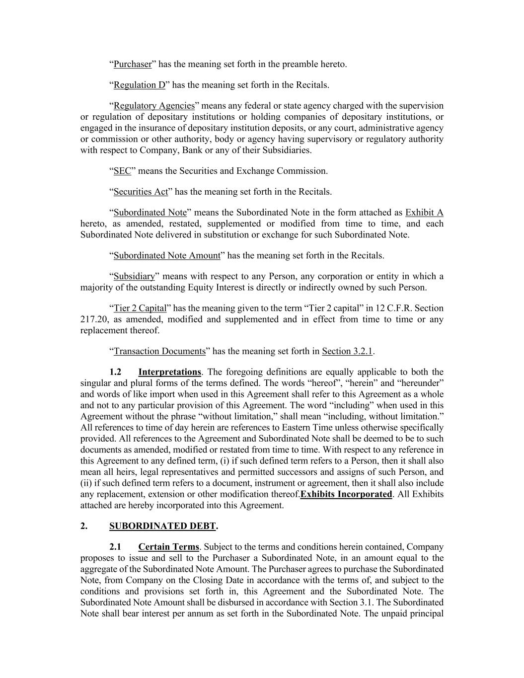 “Purchaser” has the meaning set forth in the preamble hereto. “Regulation D” has the meaning set forth in the Recitals. “Regulatory Agencies” means any federal or state agency charged with the supervision or regulation of depositary institutions or holding companies of depositary institutions, or engaged in the insurance of depositary institution deposits, or any court, administrative agency or commission or other authority, body or agency having supervisory or regulatory authority with respect to Company, Bank or any of their Subsidiaries. “SEC” means the Securities and Exchange Commission. “Securities Act” has the meaning set forth in the Recitals. “Subordinated Note” means the Subordinated Note in the form attached as Exhibit A hereto, as amended, restated, supplemented or modified from time to time, and each Subordinated Note delivered in substitution or exchange for such Subordinated Note. “Subordinated Note Amount” has the meaning set forth in the Recitals. “Subsidiary” means with respect to any Person, any corporation or entity in which a majority of the outstanding Equity Interest is directly or indirectly owned by such Person. “Tier 2 Capital” has the meaning given to the term “Tier 2 capital” in 12 C.F.R. Section 217.20, as amended, modified and supplemented and in effect from time to time or any replacement thereof. “Transaction Documents” has the meaning set forth in Section 3.2.1. 1.2 Interpretations. The foregoing definitions are equally applicable to both the singular and plural forms of the terms defined. The words “hereof”, “herein” and “hereunder” and words of like import when used in this Agreement shall refer to this Agreement as a whole and not to any particular provision of this Agreement. The word “including” when used in this Agreement without the phrase “without limitation,” shall mean “including, without limitation.” All references to time of day herein are references to Eastern Time unless otherwise specifically provided. All references to the Agreement and Subordinated Note shall be deemed to be to such documents as amended, modified or restated from time to time. With respect to any reference in this Agreement to any defined term, (i) if such defined term refers to a Person, then it shall also mean all heirs, legal representatives and permitted successors and assigns of such Person, and (ii) if such defined term refers to a document, instrument or agreement, then it shall also include any replacement, extension or other modification thereof.Exhibits Incorporated. All Exhibits attached are hereby incorporated into this Agreement. 2. SUBORDINATED DEBT. 2.1 Certain Terms. Subject to the terms and conditions herein contained, Company proposes to issue and sell to the Purchaser a Subordinated Note, in an amount equal to the aggregate of the Subordinated Note Amount. The Purchaser agrees to purchase the Subordinated Note, from Company on the Closing Date in accordance with the terms of, and subject to the conditions and provisions set forth in, this Agreement and the Subordinated Note. The Subordinated Note Amount shall be disbursed in accordance with Section 3.1. The Subordinated Note shall bear interest per annum as set forth in the Subordinated Note. The unpaid principal