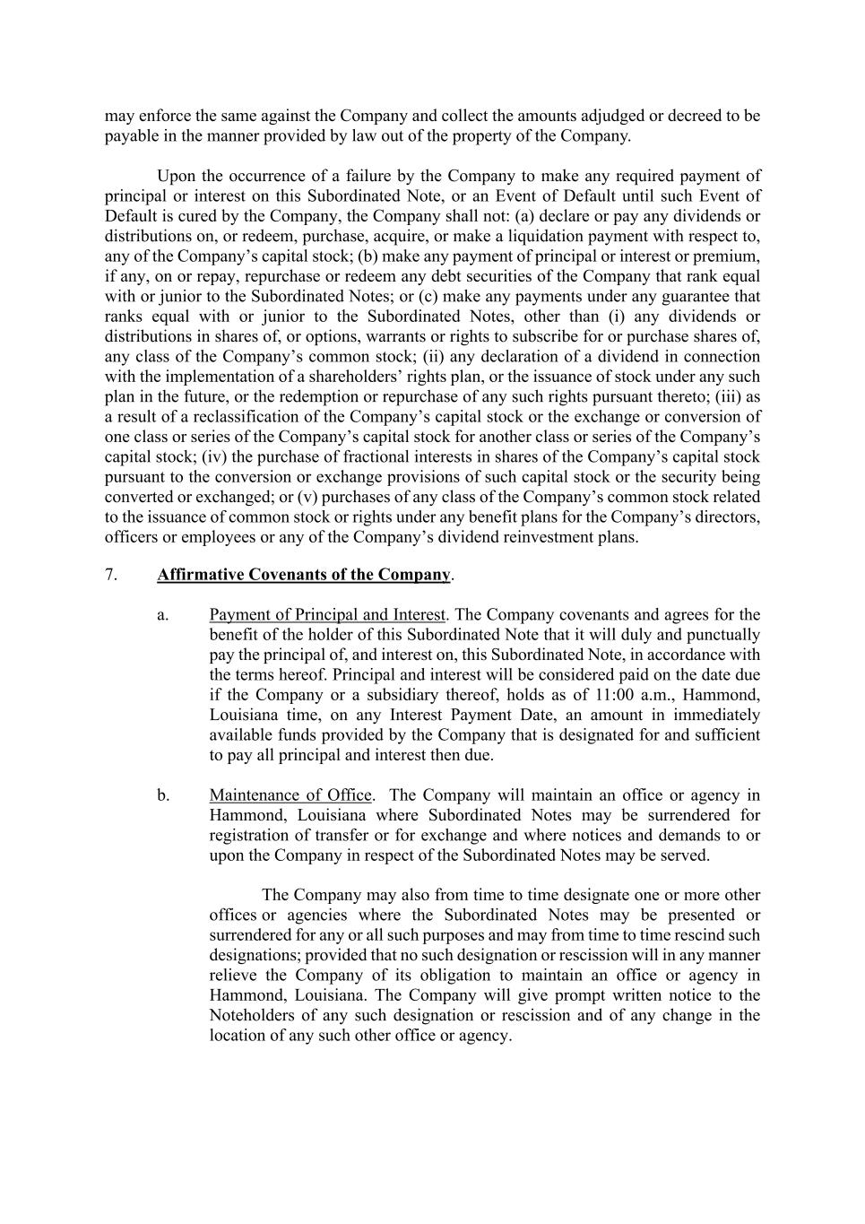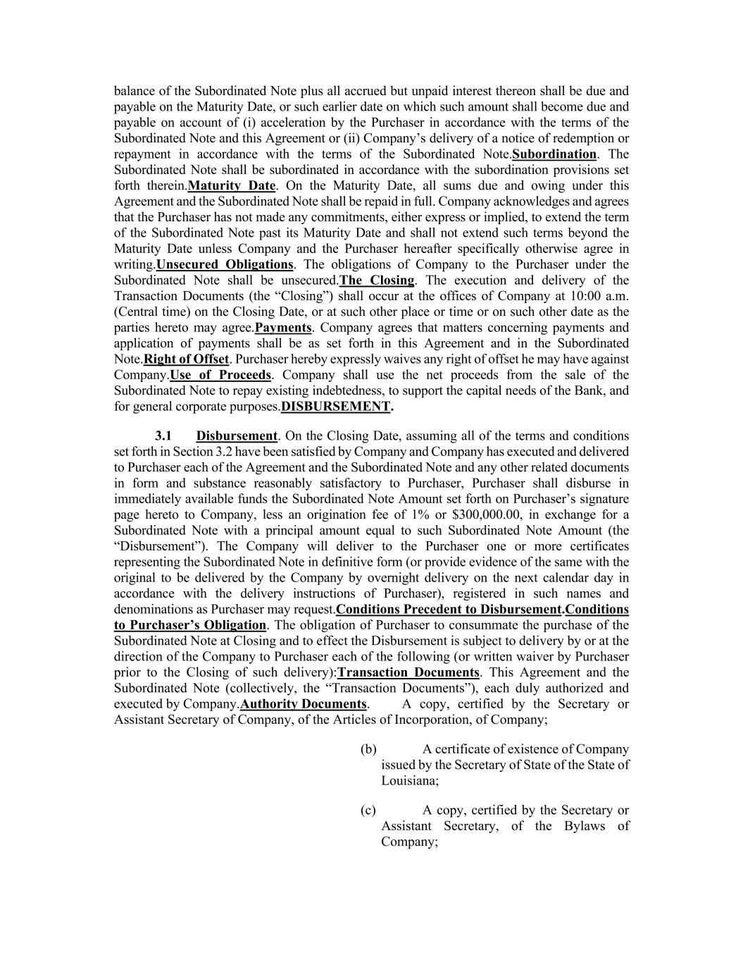 balance of the Subordinated Note plus all accrued but unpaid interest thereon shall be due and payable on the Maturity Date, or such earlier date on which such amount shall become due and payable on account of (i) acceleration by the Purchaser in accordance with the terms of the Subordinated Note and this Agreement or (ii) Company’s delivery of a notice of redemption or repayment in accordance with the terms of the Subordinated Note.Subordination. The Subordinated Note shall be subordinated in accordance with the subordination provisions set forth therein.Maturity Date. On the Maturity Date, all sums due and owing under this Agreement and the Subordinated Note shall be repaid in full. Company acknowledges and agrees that the Purchaser has not made any commitments, either express or implied, to extend the term of the Subordinated Note past its Maturity Date and shall not extend such terms beyond the Maturity Date unless Company and the Purchaser hereafter specifically otherwise agree in writing.Unsecured Obligations. The obligations of Company to the Purchaser under the Subordinated Note shall be unsecured.The Closing. The execution and delivery of the Transaction Documents (the “Closing”) shall occur at the offices of Company at 10:00 a.m. (Central time) on the Closing Date, or at such other place or time or on such other date as the parties hereto may agree.Payments. Company agrees that matters concerning payments and application of payments shall be as set forth in this Agreement and in the Subordinated Note.Right of Offset. Purchaser hereby expressly waives any right of offset he may have against Company.Use of Proceeds. Company shall use the net proceeds from the sale of the Subordinated Note to repay existing indebtedness, to support the capital needs of the Bank, and for general corporate purposes.DISBURSEMENT. 3.1 Disbursement. On the Closing Date, assuming all of the terms and conditions set forth in Section 3.2 have been satisfied by Company and Company has executed and delivered to Purchaser each of the Agreement and the Subordinated Note and any other related documents in form and substance reasonably satisfactory to Purchaser, Purchaser shall disburse in immediately available funds the Subordinated Note Amount set forth on Purchaser’s signature page hereto to Company, less an origination fee of 1% or $300,000.00, in exchange for a Subordinated Note with a principal amount equal to such Subordinated Note Amount (the “Disbursement”). The Company will deliver to the Purchaser one or more certificates representing the Subordinated Note in definitive form (or provide evidence of the same with the original to be delivered by the Company by overnight delivery on the next calendar day in accordance with the delivery instructions of Purchaser), registered in such names and denominations as Purchaser may request.Conditions Precedent to Disbursement.Conditions to Purchaser’s Obligation. The obligation of Purchaser to consummate the purchase of the Subordinated Note at Closing and to effect the Disbursement is subject to delivery by or at the direction of the Company to Purchaser each of the following (or written waiver by Purchaser prior to the Closing of such delivery):Transaction Documents. This Agreement and the Subordinated Note (collectively, the “Transaction Documents”), each duly authorized and executed by Company.Authority Documents. A copy, certified by the Secretary or Assistant Secretary of Company, of the Articles of Incorporation, of Company; (b) A certificate of existence of Company issued by the Secretary of State of the State of Louisiana; (c) A copy, certified by the Secretary or Assistant Secretary, of the Bylaws of Company;