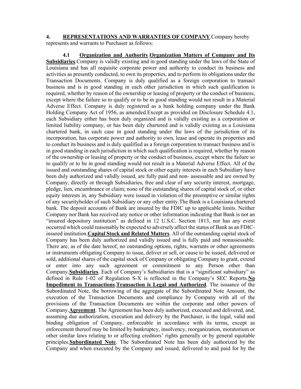 4. REPRESENTATIONS AND WARRANTIES OF COMPANY.Company hereby represents and warrants to Purchaser as follows: 4.1 Organization and Authority.Organization Matters of Company and Its Subsidiaries.Company is validly existing and in good standing under the laws of the State of Louisiana and has all requisite corporate power and authority to conduct its business and activities as presently conducted, to own its properties, and to perform its obligations under the Transaction Documents. Company is duly qualified as a foreign corporation to transact business and is in good standing in each other jurisdiction in which such qualification is required, whether by reason of the ownership or leasing of property or the conduct of business, except where the failure so to qualify or to be in good standing would not result in a Material Adverse Effect. Company is duly registered as a bank holding company under the Bank Holding Company Act of 1956, as amended.Except as provided on Disclosure Schedule 4.1, each Subsidiary either has been duly organized and is validly existing as a corporation or limited liability company, or has been duly chartered and is validly existing as a Louisiana chartered bank, in each case in good standing under the laws of the jurisdiction of its incorporation, has corporate power and authority to own, lease and operate its properties and to conduct its business and is duly qualified as a foreign corporation to transact business and is in good standing in each jurisdiction in which such qualification is required, whether by reason of the ownership or leasing of property or the conduct of business, except where the failure so to qualify or to be in good standing would not result in a Material Adverse Effect. All of the issued and outstanding shares of capital stock or other equity interests in each Subsidiary have been duly authorized and validly issued, are fully paid and non- assessable and are owned by Company, directly or through Subsidiaries, free and clear of any security interest, mortgage, pledge, lien, encumbrance or claim; none of the outstanding shares of capital stock of, or other equity interests in, any Subsidiary were issued in violation of the preemptive or similar rights of any securityholder of such Subsidiary or any other entity.The Bank is a Louisiana chartered bank. The deposit accounts of Bank are insured by the FDIC up to applicable limits. Neither Company nor Bank has received any notice or other information indicating that Bank is not an “insured depository institution” as defined in 12 U.S.C. Section 1813, nor has any event occurred which could reasonably be expected to adversely affect the status of Bank as an FDIC- insured institution.Capital Stock and Related Matters. All of the outstanding capital stock of Company has been duly authorized and validly issued and is fully paid and nonassessable. There are, as of the date hereof, no outstanding options, rights, warrants or other agreements or instruments obligating Company to issue, deliver or sell, or cause to be issued, delivered or sold, additional shares of the capital stock of Company or obligating Company to grant, extend or enter into any such agreement or commitment to any Person other than Company.Subsidiaries. Each of Company’s Subsidiaries that is a “significant subsidiary” as defined in Rule 1-02 of Regulation S-X is reflected in the Company’s SEC Reports.No Impediment to Transactions.Transaction is Legal and Authorized. The issuance of the Subordinated Note, the borrowing of the aggregate of the Subordinated Note Amount, the execution of the Transaction Documents and compliance by Company with all of the provisions of the Transaction Documents are within the corporate and other powers of Company.Agreement. The Agreement has been duly authorized, executed and delivered, and, assuming due authorization, execution and delivery by the Purchaser, is the legal, valid and binding obligation of Company, enforceable in accordance with its terms, except as enforcement thereof may be limited by bankruptcy, insolvency, reorganization, moratorium or other similar laws relating to or affecting creditors’ rights generally or by general equitable principles.Subordinated Note. The Subordinated Note has been duly authorized by the Company and when executed by the Company and issued, delivered to and paid for by the