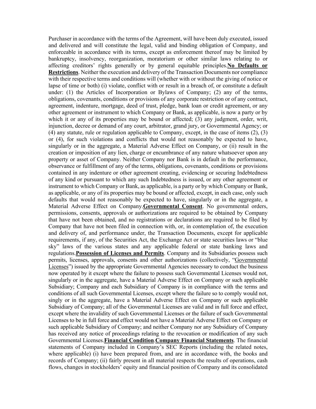 Purchaser in accordance with the terms of the Agreement, will have been duly executed, issued and delivered and will constitute the legal, valid and binding obligation of Company, and enforceable in accordance with its terms, except as enforcement thereof may be limited by bankruptcy, insolvency, reorganization, moratorium or other similar laws relating to or affecting creditors’ rights generally or by general equitable principles.No Defaults or Restrictions. Neither the execution and delivery of the Transaction Documents nor compliance with their respective terms and conditions will (whether with or without the giving of notice or lapse of time or both) (i) violate, conflict with or result in a breach of, or constitute a default under: (1) the Articles of Incorporation or Bylaws of Company; (2) any of the terms, obligations, covenants, conditions or provisions of any corporate restriction or of any contract, agreement, indenture, mortgage, deed of trust, pledge, bank loan or credit agreement, or any other agreement or instrument to which Company or Bank, as applicable, is now a party or by which it or any of its properties may be bound or affected; (3) any judgment, order, writ, injunction, decree or demand of any court, arbitrator, grand jury, or Governmental Agency; or (4) any statute, rule or regulation applicable to Company, except, in the case of items (2), (3) or (4), for such violations and conflicts that would not reasonably be expected to have, singularly or in the aggregate, a Material Adverse Effect on Company, or (ii) result in the creation or imposition of any lien, charge or encumbrance of any nature whatsoever upon any property or asset of Company. Neither Company nor Bank is in default in the performance, observance or fulfillment of any of the terms, obligations, covenants, conditions or provisions contained in any indenture or other agreement creating, evidencing or securing Indebtedness of any kind or pursuant to which any such Indebtedness is issued, or any other agreement or instrument to which Company or Bank, as applicable, is a party or by which Company or Bank, as applicable, or any of its properties may be bound or affected, except, in each case, only such defaults that would not reasonably be expected to have, singularly or in the aggregate, a Material Adverse Effect on Company.Governmental Consent. No governmental orders, permissions, consents, approvals or authorizations are required to be obtained by Company that have not been obtained, and no registrations or declarations are required to be filed by Company that have not been filed in connection with, or, in contemplation of, the execution and delivery of, and performance under, the Transaction Documents, except for applicable requirements, if any, of the Securities Act, the Exchange Act or state securities laws or “blue sky” laws of the various states and any applicable federal or state banking laws and regulations.Possession of Licenses and Permits. Company and its Subsidiaries possess such permits, licenses, approvals, consents and other authorizations (collectively, “Governmental Licenses”) issued by the appropriate Governmental Agencies necessary to conduct the business now operated by it except where the failure to possess such Governmental Licenses would not, singularly or in the aggregate, have a Material Adverse Effect on Company or such applicable Subsidiary; Company and each Subsidiary of Company is in compliance with the terms and conditions of all such Governmental Licenses, except where the failure so to comply would not, singly or in the aggregate, have a Material Adverse Effect on Company or such applicable Subsidiary of Company; all of the Governmental Licenses are valid and in full force and effect, except where the invalidity of such Governmental Licenses or the failure of such Governmental Licenses to be in full force and effect would not have a Material Adverse Effect on Company or such applicable Subsidiary of Company; and neither Company nor any Subsidiary of Company has received any notice of proceedings relating to the revocation or modification of any such Governmental Licenses.Financial Condition.Company Financial Statements. The financial statements of Company included in Company’s SEC Reports (including the related notes, where applicable) (i) have been prepared from, and are in accordance with, the books and records of Company; (ii) fairly present in all material respects the results of operations, cash flows, changes in stockholders’ equity and financial position of Company and its consolidated