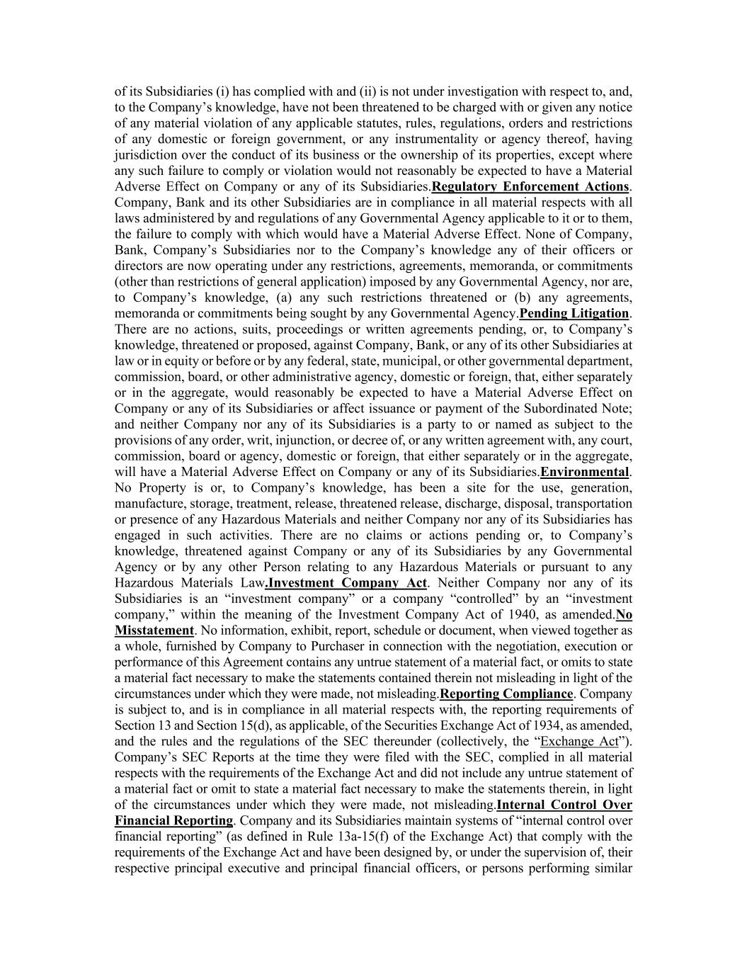 of its Subsidiaries (i) has complied with and (ii) is not under investigation with respect to, and, to the Company’s knowledge, have not been threatened to be charged with or given any notice of any material violation of any applicable statutes, rules, regulations, orders and restrictions of any domestic or foreign government, or any instrumentality or agency thereof, having jurisdiction over the conduct of its business or the ownership of its properties, except where any such failure to comply or violation would not reasonably be expected to have a Material Adverse Effect on Company or any of its Subsidiaries.Regulatory Enforcement Actions. Company, Bank and its other Subsidiaries are in compliance in all material respects with all laws administered by and regulations of any Governmental Agency applicable to it or to them, the failure to comply with which would have a Material Adverse Effect. None of Company, Bank, Company’s Subsidiaries nor to the Company’s knowledge any of their officers or directors are now operating under any restrictions, agreements, memoranda, or commitments (other than restrictions of general application) imposed by any Governmental Agency, nor are, to Company’s knowledge, (a) any such restrictions threatened or (b) any agreements, memoranda or commitments being sought by any Governmental Agency.Pending Litigation. There are no actions, suits, proceedings or written agreements pending, or, to Company’s knowledge, threatened or proposed, against Company, Bank, or any of its other Subsidiaries at law or in equity or before or by any federal, state, municipal, or other governmental department, commission, board, or other administrative agency, domestic or foreign, that, either separately or in the aggregate, would reasonably be expected to have a Material Adverse Effect on Company or any of its Subsidiaries or affect issuance or payment of the Subordinated Note; and neither Company nor any of its Subsidiaries is a party to or named as subject to the provisions of any order, writ, injunction, or decree of, or any written agreement with, any court, commission, board or agency, domestic or foreign, that either separately or in the aggregate, will have a Material Adverse Effect on Company or any of its Subsidiaries.Environmental. No Property is or, to Company’s knowledge, has been a site for the use, generation, manufacture, storage, treatment, release, threatened release, discharge, disposal, transportation or presence of any Hazardous Materials and neither Company nor any of its Subsidiaries has engaged in such activities. There are no claims or actions pending or, to Company’s knowledge, threatened against Company or any of its Subsidiaries by any Governmental Agency or by any other Person relating to any Hazardous Materials or pursuant to any Hazardous Materials Law.Investment Company Act. Neither Company nor any of its Subsidiaries is an “investment company” or a company “controlled” by an “investment company,” within the meaning of the Investment Company Act of 1940, as amended.No Misstatement. No information, exhibit, report, schedule or document, when viewed together as a whole, furnished by Company to Purchaser in connection with the negotiation, execution or performance of this Agreement contains any untrue statement of a material fact, or omits to state a material fact necessary to make the statements contained therein not misleading in light of the circumstances under which they were made, not misleading.Reporting Compliance. Company is subject to, and is in compliance in all material respects with, the reporting requirements of Section 13 and Section 15(d), as applicable, of the Securities Exchange Act of 1934, as amended, and the rules and the regulations of the SEC thereunder (collectively, the “Exchange Act”). Company’s SEC Reports at the time they were filed with the SEC, complied in all material respects with the requirements of the Exchange Act and did not include any untrue statement of a material fact or omit to state a material fact necessary to make the statements therein, in light of the circumstances under which they were made, not misleading.Internal Control Over Financial Reporting. Company and its Subsidiaries maintain systems of “internal control over financial reporting” (as defined in Rule 13a-15(f) of the Exchange Act) that comply with the requirements of the Exchange Act and have been designed by, or under the supervision of, their respective principal executive and principal financial officers, or persons performing similar
