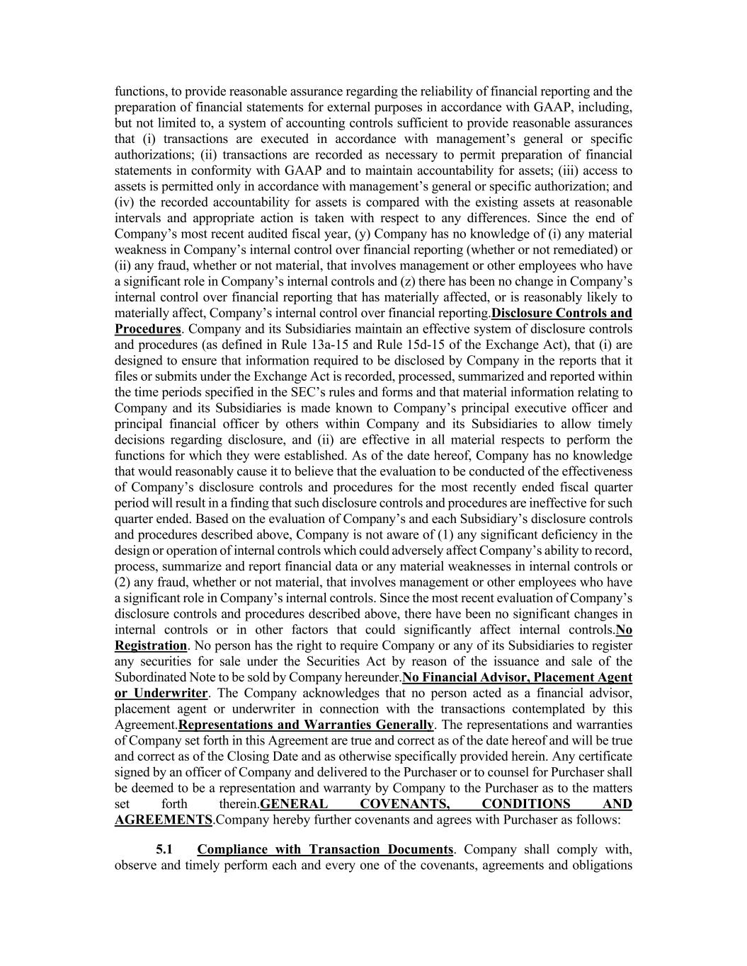 functions, to provide reasonable assurance regarding the reliability of financial reporting and the preparation of financial statements for external purposes in accordance with GAAP, including, but not limited to, a system of accounting controls sufficient to provide reasonable assurances that (i) transactions are executed in accordance with management’s general or specific authorizations; (ii) transactions are recorded as necessary to permit preparation of financial statements in conformity with GAAP and to maintain accountability for assets; (iii) access to assets is permitted only in accordance with management’s general or specific authorization; and (iv) the recorded accountability for assets is compared with the existing assets at reasonable intervals and appropriate action is taken with respect to any differences. Since the end of Company’s most recent audited fiscal year, (y) Company has no knowledge of (i) any material weakness in Company’s internal control over financial reporting (whether or not remediated) or (ii) any fraud, whether or not material, that involves management or other employees who have a significant role in Company’s internal controls and (z) there has been no change in Company’s internal control over financial reporting that has materially affected, or is reasonably likely to materially affect, Company’s internal control over financial reporting.Disclosure Controls and Procedures. Company and its Subsidiaries maintain an effective system of disclosure controls and procedures (as defined in Rule 13a-15 and Rule 15d-15 of the Exchange Act), that (i) are designed to ensure that information required to be disclosed by Company in the reports that it files or submits under the Exchange Act is recorded, processed, summarized and reported within the time periods specified in the SEC’s rules and forms and that material information relating to Company and its Subsidiaries is made known to Company’s principal executive officer and principal financial officer by others within Company and its Subsidiaries to allow timely decisions regarding disclosure, and (ii) are effective in all material respects to perform the functions for which they were established. As of the date hereof, Company has no knowledge that would reasonably cause it to believe that the evaluation to be conducted of the effectiveness of Company’s disclosure controls and procedures for the most recently ended fiscal quarter period will result in a finding that such disclosure controls and procedures are ineffective for such quarter ended. Based on the evaluation of Company’s and each Subsidiary’s disclosure controls and procedures described above, Company is not aware of (1) any significant deficiency in the design or operation of internal controls which could adversely affect Company’s ability to record, process, summarize and report financial data or any material weaknesses in internal controls or (2) any fraud, whether or not material, that involves management or other employees who have a significant role in Company’s internal controls. Since the most recent evaluation of Company’s disclosure controls and procedures described above, there have been no significant changes in internal controls or in other factors that could significantly affect internal controls.No Registration. No person has the right to require Company or any of its Subsidiaries to register any securities for sale under the Securities Act by reason of the issuance and sale of the Subordinated Note to be sold by Company hereunder.No Financial Advisor, Placement Agent or Underwriter. The Company acknowledges that no person acted as a financial advisor, placement agent or underwriter in connection with the transactions contemplated by this Agreement.Representations and Warranties Generally. The representations and warranties of Company set forth in this Agreement are true and correct as of the date hereof and will be true and correct as of the Closing Date and as otherwise specifically provided herein. Any certificate signed by an officer of Company and delivered to the Purchaser or to counsel for Purchaser shall be deemed to be a representation and warranty by Company to the Purchaser as to the matters set forth therein.GENERAL COVENANTS, CONDITIONS AND AGREEMENTS.Company hereby further covenants and agrees with Purchaser as follows: 5.1 Compliance with Transaction Documents. Company shall comply with, observe and timely perform each and every one of the covenants, agreements and obligations