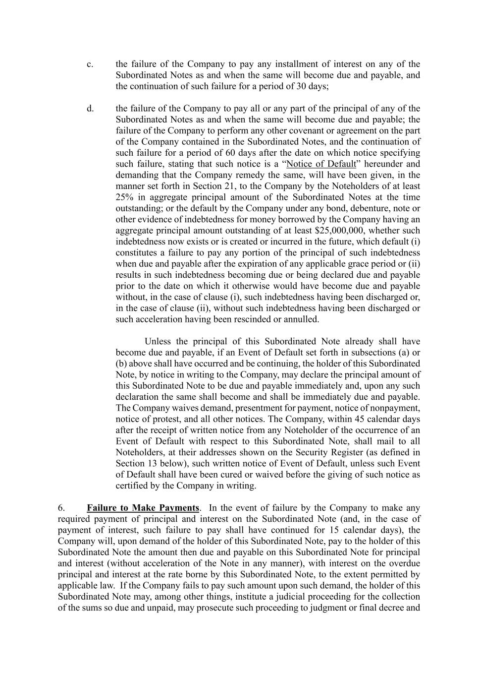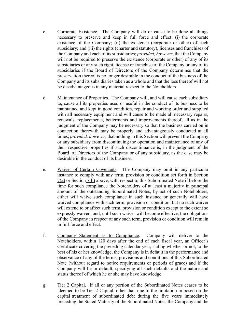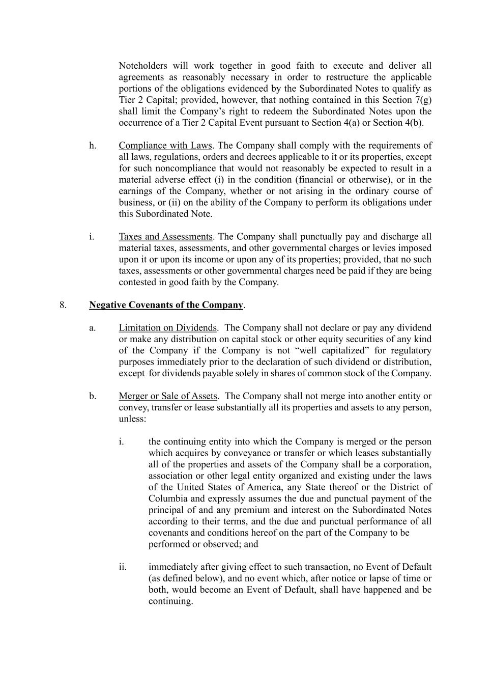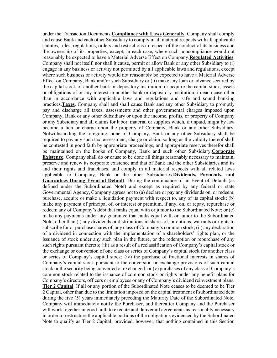 under the Transaction Documents.Compliance with Laws.Generally. Company shall comply and cause Bank and each other Subsidiary to comply in all material respects with all applicable statutes, rules, regulations, orders and restrictions in respect of the conduct of its business and the ownership of its properties, except, in each case, where such noncompliance would not reasonably be expected to have a Material Adverse Effect on Company.Regulated Activities. Company shall not itself, nor shall it cause, permit or allow Bank or any other Subsidiary to (i) engage in any business or activity not permitted by all applicable laws and regulations, except where such business or activity would not reasonably be expected to have a Material Adverse Effect on Company, Bank and/or such Subsidiary or (ii) make any loan or advance secured by the capital stock of another bank or depository institution, or acquire the capital stock, assets or obligations of or any interest in another bank or depository institution, in each case other than in accordance with applicable laws and regulations and safe and sound banking practices.Taxes. Company shall and shall cause Bank and any other Subsidiary to promptly pay and discharge all taxes, assessments and other governmental charges imposed upon Company, Bank or any other Subsidiary or upon the income, profits, or property of Company or any Subsidiary and all claims for labor, material or supplies which, if unpaid, might by law become a lien or charge upon the property of Company, Bank or any other Subsidiary. Notwithstanding the foregoing, none of Company, Bank or any other Subsidiary shall be required to pay any such tax, assessment, charge or claim, so long as the validity thereof shall be contested in good faith by appropriate proceedings, and appropriate reserves therefor shall be maintained on the books of Company, Bank and such other Subsidiary.Corporate Existence. Company shall do or cause to be done all things reasonably necessary to maintain, preserve and renew its corporate existence and that of Bank and the other Subsidiaries and its and their rights and franchises, and comply in all material respects with all related laws applicable to Company, Bank or the other Subsidiaries.Dividends, Payments, and Guarantees During Event of Default. During the continuance of an Event of Default (as defined under the Subordinated Note) and except as required by any federal or state Governmental Agency, Company agrees not to (a) declare or pay any dividends on, or redeem, purchase, acquire or make a liquidation payment with respect to, any of its capital stock; (b) make any payment of principal of, or interest or premium, if any, on, or repay, repurchase or redeem any of Company’s debt that ranks equal with or junior to the Subordinated Note; or (c) make any payments under any guarantee that ranks equal with or junior to the Subordinated Note, other than (i) any dividends or distributions in shares of, or options, warrants or rights to subscribe for or purchase shares of, any class of Company’s common stock; (ii) any declaration of a dividend in connection with the implementation of a shareholders’ rights plan, or the issuance of stock under any such plan in the future, or the redemption or repurchase of any such rights pursuant thereto; (iii) as a result of a reclassification of Company’s capital stock or the exchange or conversion of one class or series of Company’s capital stock for another class or series of Company’s capital stock; (iv) the purchase of fractional interests in shares of Company’s capital stock pursuant to the conversion or exchange provisions of such capital stock or the security being converted or exchanged; or (v) purchases of any class of Company’s common stock related to the issuance of common stock or rights under any benefit plans for Company’s directors, officers or employees or any of Company’s dividend reinvestment plans. Tier 2 Capital. If all or any portion of the Subordinated Note ceases to be deemed to be Tier 2 Capital, other than due to the limitation imposed on the capital treatment of subordinated debt during the five (5) years immediately preceding the Maturity Date of the Subordinated Note, Company will immediately notify the Purchaser, and thereafter Company and the Purchaser will work together in good faith to execute and deliver all agreements as reasonably necessary in order to restructure the applicable portions of the obligations evidenced by the Subordinated Note to qualify as Tier 2 Capital; provided, however, that nothing contained in this Section