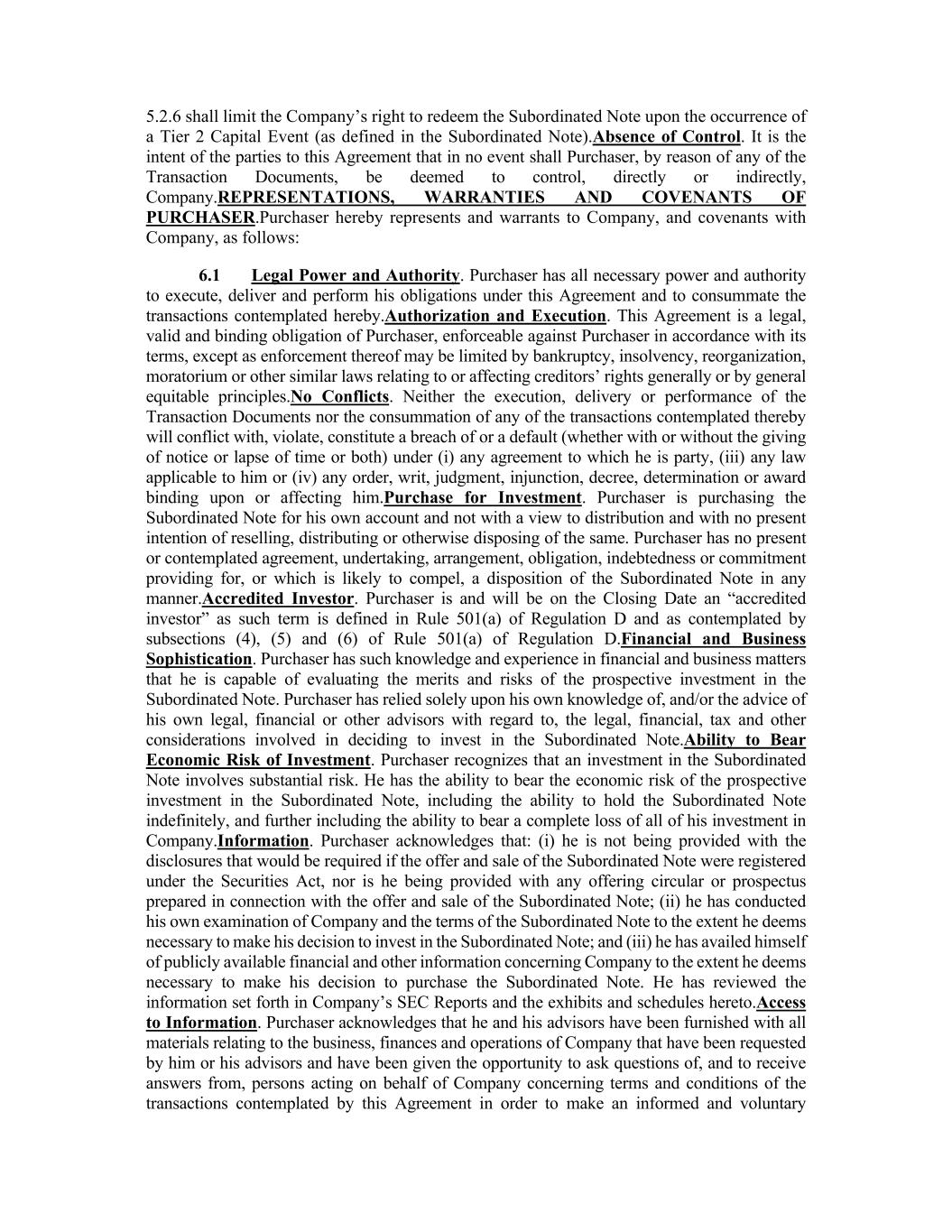 5.2.6 shall limit the Company’s right to redeem the Subordinated Note upon the occurrence of a Tier 2 Capital Event (as defined in the Subordinated Note).Absence of Control. It is the intent of the parties to this Agreement that in no event shall Purchaser, by reason of any of the Transaction Documents, be deemed to control, directly or indirectly, Company.REPRESENTATIONS, WARRANTIES AND COVENANTS OF PURCHASER.Purchaser hereby represents and warrants to Company, and covenants with Company, as follows: 6.1 Legal Power and Authority. Purchaser has all necessary power and authority to execute, deliver and perform his obligations under this Agreement and to consummate the transactions contemplated hereby.Authorization and Execution. This Agreement is a legal, valid and binding obligation of Purchaser, enforceable against Purchaser in accordance with its terms, except as enforcement thereof may be limited by bankruptcy, insolvency, reorganization, moratorium or other similar laws relating to or affecting creditors’ rights generally or by general equitable principles.No Conflicts. Neither the execution, delivery or performance of the Transaction Documents nor the consummation of any of the transactions contemplated thereby will conflict with, violate, constitute a breach of or a default (whether with or without the giving of notice or lapse of time or both) under (i) any agreement to which he is party, (iii) any law applicable to him or (iv) any order, writ, judgment, injunction, decree, determination or award binding upon or affecting him.Purchase for Investment. Purchaser is purchasing the Subordinated Note for his own account and not with a view to distribution and with no present intention of reselling, distributing or otherwise disposing of the same. Purchaser has no present or contemplated agreement, undertaking, arrangement, obligation, indebtedness or commitment providing for, or which is likely to compel, a disposition of the Subordinated Note in any manner.Accredited Investor. Purchaser is and will be on the Closing Date an “accredited investor” as such term is defined in Rule 501(a) of Regulation D and as contemplated by subsections (4), (5) and (6) of Rule 501(a) of Regulation D.Financial and Business Sophistication. Purchaser has such knowledge and experience in financial and business matters that he is capable of evaluating the merits and risks of the prospective investment in the Subordinated Note. Purchaser has relied solely upon his own knowledge of, and/or the advice of his own legal, financial or other advisors with regard to, the legal, financial, tax and other considerations involved in deciding to invest in the Subordinated Note.Ability to Bear Economic Risk of Investment. Purchaser recognizes that an investment in the Subordinated Note involves substantial risk. He has the ability to bear the economic risk of the prospective investment in the Subordinated Note, including the ability to hold the Subordinated Note indefinitely, and further including the ability to bear a complete loss of all of his investment in Company.Information. Purchaser acknowledges that: (i) he is not being provided with the disclosures that would be required if the offer and sale of the Subordinated Note were registered under the Securities Act, nor is he being provided with any offering circular or prospectus prepared in connection with the offer and sale of the Subordinated Note; (ii) he has conducted his own examination of Company and the terms of the Subordinated Note to the extent he deems necessary to make his decision to invest in the Subordinated Note; and (iii) he has availed himself of publicly available financial and other information concerning Company to the extent he deems necessary to make his decision to purchase the Subordinated Note. He has reviewed the information set forth in Company’s SEC Reports and the exhibits and schedules hereto.Access to Information. Purchaser acknowledges that he and his advisors have been furnished with all materials relating to the business, finances and operations of Company that have been requested by him or his advisors and have been given the opportunity to ask questions of, and to receive answers from, persons acting on behalf of Company concerning terms and conditions of the transactions contemplated by this Agreement in order to make an informed and voluntary