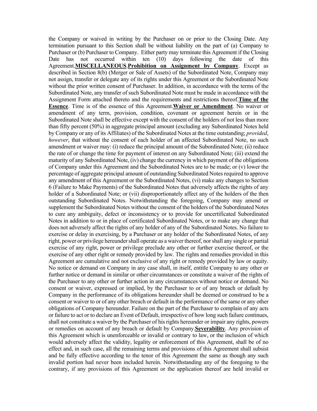 the Company or waived in writing by the Purchaser on or prior to the Closing Date. Any termination pursuant to this Section shall be without liability on the part of (a) Company to Purchaser or (b) Purchaser to Company. Either party may terminate this Agreement if the Closing Date has not occurred within ten (10) days following the date of this Agreement.MISCELLANEOUS.Prohibition on Assignment by Company. Except as described in Section 8(b) (Merger or Sale of Assets) of the Subordinated Note, Company may not assign, transfer or delegate any of its rights under this Agreement or the Subordinated Note without the prior written consent of Purchaser. In addition, in accordance with the terms of the Subordinated Note, any transfer of such Subordinated Note must be made in accordance with the Assignment Form attached thereto and the requirements and restrictions thereof.Time of the Essence. Time is of the essence of this Agreement.Waiver or Amendment. No waiver or amendment of any term, provision, condition, covenant or agreement herein or in the Subordinated Note shall be effective except with the consent of the holders of not less than more than fifty percent (50%) in aggregate principal amount (excluding any Subordinated Notes held by Company or any of its Affiliates) of the Subordinated Notes at the time outstanding; provided, however, that without the consent of each holder of an affected Subordinated Note, no such amendment or waiver may: (i) reduce the principal amount of the Subordinated Note; (ii) reduce the rate of or change the time for payment of interest on any Subordinated Note; (iii) extend the maturity of any Subordinated Note, (iv) change the currency in which payment of the obligations of Company under this Agreement and the Subordinated Notes are to be made; or (v) lower the percentage of aggregate principal amount of outstanding Subordinated Notes required to approve any amendment of this Agreement or the Subordinated Notes, (vi) make any changes to Section 6 (Failure to Make Payments) of the Subordinated Notes that adversely affects the rights of any holder of a Subordinated Note; or (vii) disproportionately affect any of the holders of the then outstanding Subordinated Notes. Notwithstanding the foregoing, Company may amend or supplement the Subordinated Notes without the consent of the holders of the Subordinated Notes to cure any ambiguity, defect or inconsistency or to provide for uncertificated Subordinated Notes in addition to or in place of certificated Subordinated Notes, or to make any change that does not adversely affect the rights of any holder of any of the Subordinated Notes. No failure to exercise or delay in exercising, by a Purchaser or any holder of the Subordinated Notes, of any right, power or privilege hereunder shall operate as a waiver thereof, nor shall any single or partial exercise of any right, power or privilege preclude any other or further exercise thereof, or the exercise of any other right or remedy provided by law. The rights and remedies provided in this Agreement are cumulative and not exclusive of any right or remedy provided by law or equity. No notice or demand on Company in any case shall, in itself, entitle Company to any other or further notice or demand in similar or other circumstances or constitute a waiver of the rights of the Purchaser to any other or further action in any circumstances without notice or demand. No consent or waiver, expressed or implied, by the Purchaser to or of any breach or default by Company in the performance of its obligations hereunder shall be deemed or construed to be a consent or waiver to or of any other breach or default in the performance of the same or any other obligations of Company hereunder. Failure on the part of the Purchaser to complain of any acts or failure to act or to declare an Event of Default, irrespective of how long such failure continues, shall not constitute a waiver by the Purchaser of his rights hereunder or impair any rights, powers or remedies on account of any breach or default by Company.Severability. Any provision of this Agreement which is unenforceable or invalid or contrary to law, or the inclusion of which would adversely affect the validity, legality or enforcement of this Agreement, shall be of no effect and, in such case, all the remaining terms and provisions of this Agreement shall subsist and be fully effective according to the tenor of this Agreement the same as though any such invalid portion had never been included herein. Notwithstanding any of the foregoing to the contrary, if any provisions of this Agreement or the application thereof are held invalid or