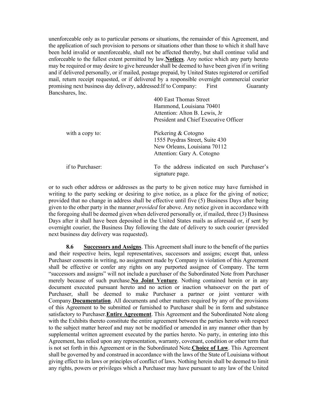 unenforceable only as to particular persons or situations, the remainder of this Agreement, and the application of such provision to persons or situations other than those to which it shall have been held invalid or unenforceable, shall not be affected thereby, but shall continue valid and enforceable to the fullest extent permitted by law.Notices. Any notice which any party hereto may be required or may desire to give hereunder shall be deemed to have been given if in writing and if delivered personally, or if mailed, postage prepaid, by United States registered or certified mail, return receipt requested, or if delivered by a responsible overnight commercial courier promising next business day delivery, addressed:If to Company: First Guaranty Bancshares, Inc. 400 East Thomas Street Hammond, Louisiana 70401 Attention: Alton B. Lewis, Jr President and Chief Executive Officer with a copy to: Pickering & Cotogno 1555 Poydras Street, Suite 430 New Orleans, Louisiana 70112 Attention: Gary A. Cotogno if to Purchaser: To the address indicated on such Purchaser’s signature page. or to such other address or addresses as the party to be given notice may have furnished in writing to the party seeking or desiring to give notice, as a place for the giving of notice; provided that no change in address shall be effective until five (5) Business Days after being given to the other party in the manner provided for above. Any notice given in accordance with the foregoing shall be deemed given when delivered personally or, if mailed, three (3) Business Days after it shall have been deposited in the United States mails as aforesaid or, if sent by overnight courier, the Business Day following the date of delivery to such courier (provided next business day delivery was requested). 8.6 Successors and Assigns. This Agreement shall inure to the benefit of the parties and their respective heirs, legal representatives, successors and assigns; except that, unless Purchaser consents in writing, no assignment made by Company in violation of this Agreement shall be effective or confer any rights on any purported assignee of Company. The term “successors and assigns” will not include a purchaser of the Subordinated Note from Purchaser merely because of such purchase.No Joint Venture. Nothing contained herein or in any document executed pursuant hereto and no action or inaction whatsoever on the part of Purchaser, shall be deemed to make Purchaser a partner or joint venturer with Company.Documentation. All documents and other matters required by any of the provisions of this Agreement to be submitted or furnished to Purchaser shall be in form and substance satisfactory to Purchaser.Entire Agreement. This Agreement and the Subordinated Note along with the Exhibits thereto constitute the entire agreement between the parties hereto with respect to the subject matter hereof and may not be modified or amended in any manner other than by supplemental written agreement executed by the parties hereto. No party, in entering into this Agreement, has relied upon any representation, warranty, covenant, condition or other term that is not set forth in this Agreement or in the Subordinated Note.Choice of Law. This Agreement shall be governed by and construed in accordance with the laws of the State of Louisiana without giving effect to its laws or principles of conflict of laws. Nothing herein shall be deemed to limit any rights, powers or privileges which a Purchaser may have pursuant to any law of the United