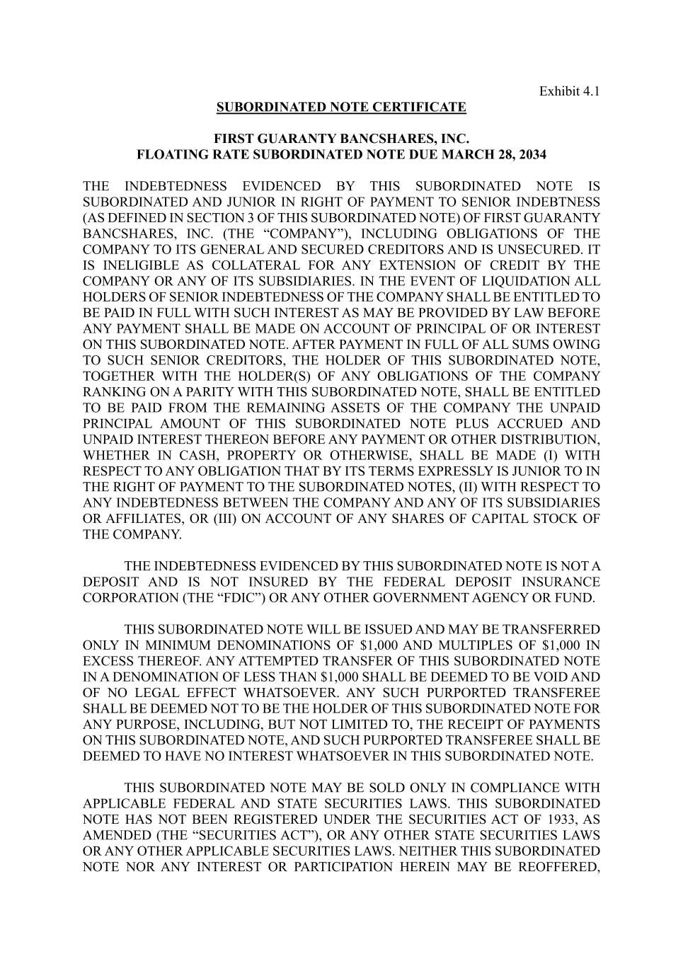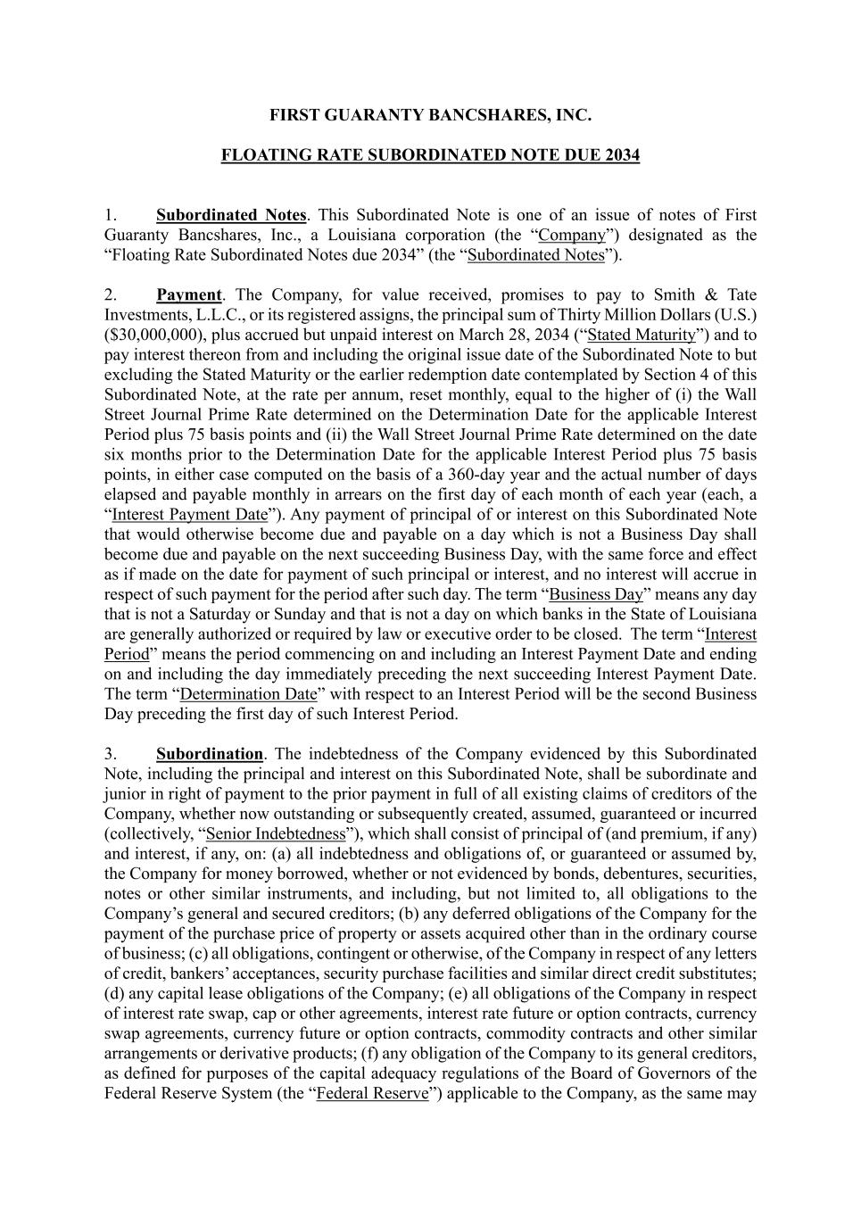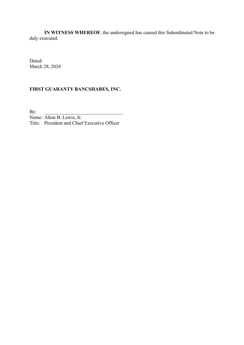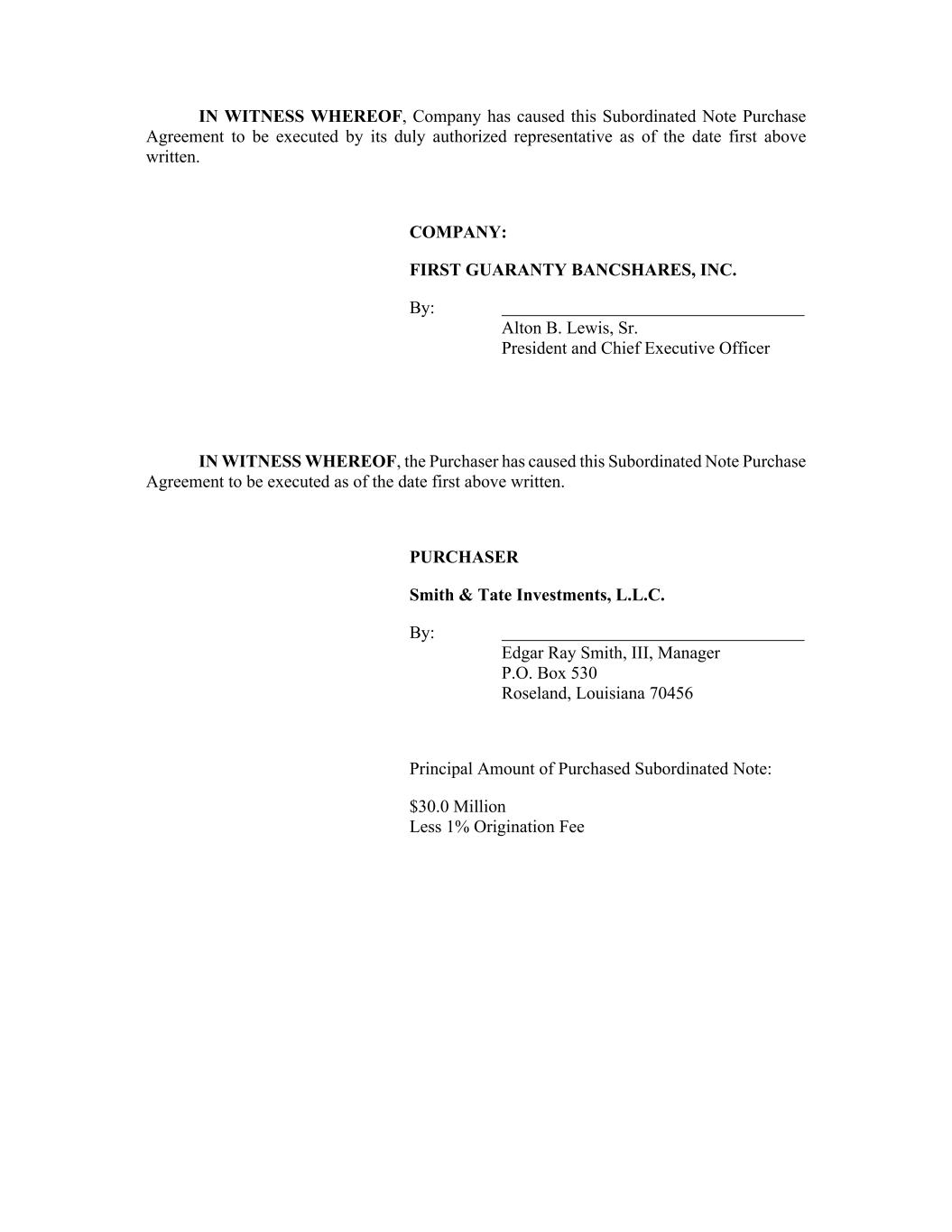 IN WITNESS WHEREOF, Company has caused this Subordinated Note Purchase Agreement to be executed by its duly authorized representative as of the date first above written. COMPANY: FIRST GUARANTY BANCSHARES, INC. By: Alton B. Lewis, Sr. President and Chief Executive Officer IN WITNESS WHEREOF, the Purchaser has caused this Subordinated Note Purchase Agreement to be executed as of the date first above written. PURCHASER Smith & Tate Investments, L.L.C. By: Edgar Ray Smith, III, Manager P.O. Box 530 Roseland, Louisiana 70456 Principal Amount of Purchased Subordinated Note: $30.0 Million Less 1% Origination Fee