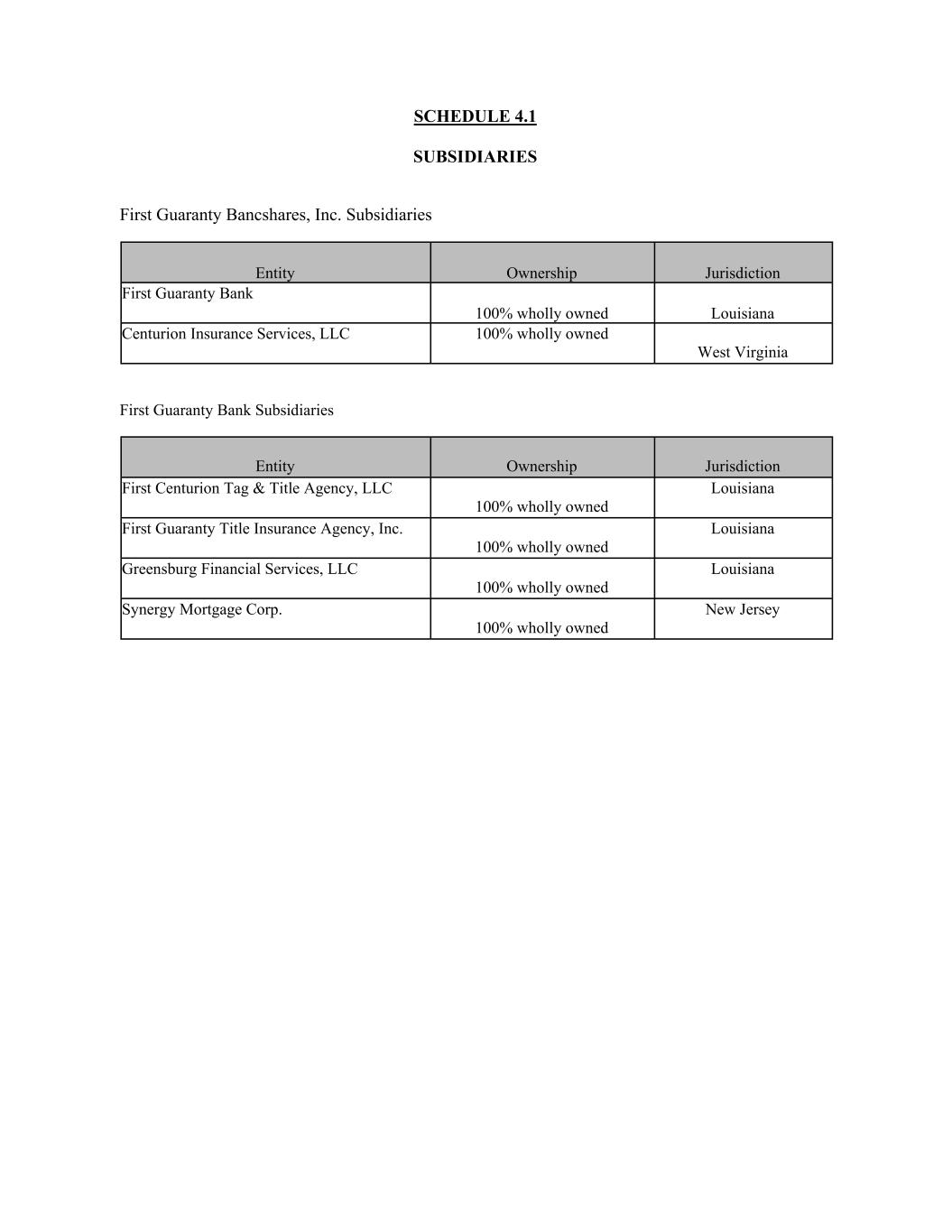 SCHEDULE 4.1 SUBSIDIARIES First Guaranty Bancshares, Inc. Subsidiaries Entity Ownership Jurisdiction First Guaranty Bank 100% wholly owned Louisiana Centurion Insurance Services, LLC 100% wholly owned West Virginia First Guaranty Bank Subsidiaries Entity Ownership Jurisdiction First Centurion Tag & Title Agency, LLC 100% wholly owned Louisiana First Guaranty Title Insurance Agency, Inc. 100% wholly owned Louisiana Greensburg Financial Services, LLC 100% wholly owned Louisiana Synergy Mortgage Corp. 100% wholly owned New Jersey