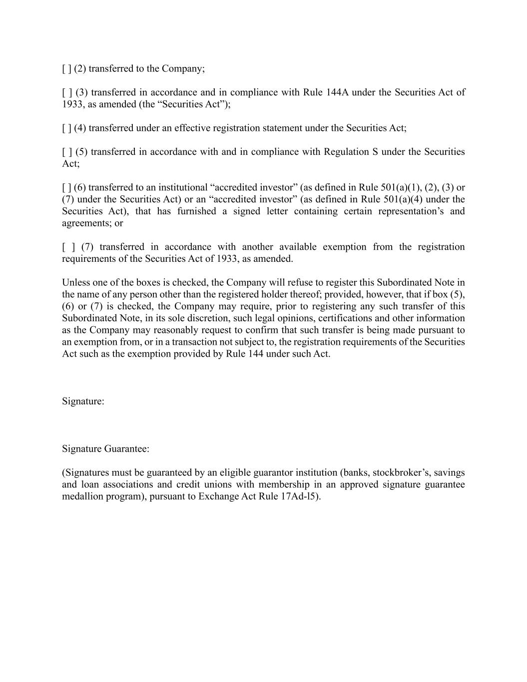 (d) A copy, certified by the Secretary or Assistant Secretary of Company, of the resolutions of the board of directors (and any committee thereof) of Company authorizing the execution, delivery and performance of the Transaction Documents; and (e) An incumbency certificate of the Secretary or Assistant Secretary of Company certifying the names of the officer or officers of Company authorized to sign the Transaction Documents and the other documents provided for in this Agreement. 3.2.1.3 Officer’s Certificate. A certificate signed on behalf of Company by a senior executive officer certifying that the representations and warranties of Company set forth in this Agreement are true and correct in all respects on and as of the date of this Agreement and on and as of the Closing Date as though made on and as of the Closing Date, except where the failure to be true and correct (without regard to any materiality or Material Adverse Effect qualifications contained therein), individually or in the aggregate, would not be reasonably likely to have a Material Adverse Effect (and except that (i) representations and warranties made as of a specified date shall only be required to be true and correct as of such date and (ii) the representations and warranties of Company set forth in Sections 4.2.1, 4.2.3 and 4.5 shall be true and correct in all respects).Other Documents. Such other certificates, affidavits, schedules, resolutions, notes and/or other documents which are provided for hereunder or as Purchaser may reasonably request.Aggregate Investments. Prior to, or contemporaneously with the Closing, Purchaser shall have actually subscribed for the Subordinated Note Amount set forth on the Purchaser’s signature page.Conditions to Company’s Obligation.Since the date of this Agreement, there shall not have been any action taken, or any law, rule or regulation enacted, entered, enforced or deemed applicable to Company or its Subsidiaries or the transactions contemplated by this Agreement by any Governmental Agency which imposes any restriction or condition that Company determines, in its reasonable good faith judgment, is materially and unreasonably burdensome on Company’s business or would materially reduce the economic benefits of the transactions contemplated by this Agreement to Company to such a degree that Company would not have entered into this Agreement had such condition or restriction been known to it on the date hereof.With respect to Purchaser, the obligation of Company to consummate the sale of the Subordinated Note and to effect the Closing is subject to delivery by or at the direction of Purchaser to Company each of the following (or written waiver by Company prior to the Closing of such delivery): Transaction Documents. This Agreement, duly authorized and executed by Purchaser. (b) Certificate. A certificate signed by Purchaser certifying that the representations and warranties of Purchaser set forth in this Agreement are true and correct in all respects on and as of the date of this Agreement and on and as of the Closing Date as though made on and as of the Closing Date.
