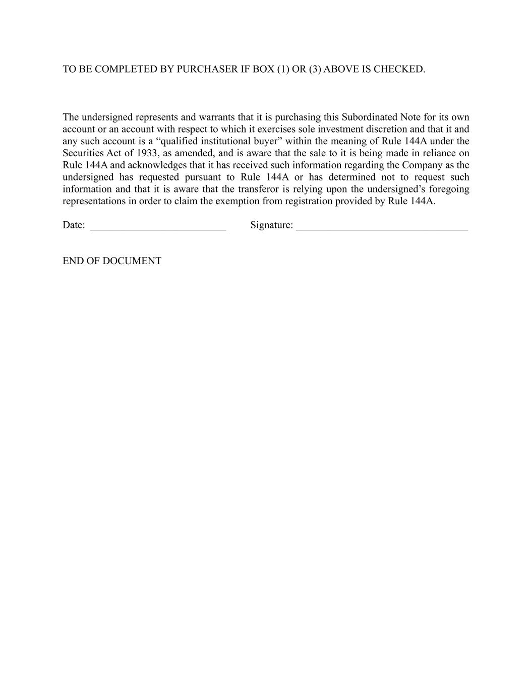 decision to enter into this Agreement.Investment Decision. Purchaser has made his own investment decision based upon his own judgment, due diligence and advice from such advisors as he has deemed necessary and not upon any view expressed by any other person or entity, including the Financial Advisor. Neither such inquiries nor any other due diligence investigations conducted by him or his advisors or representatives, if any, shall modify, amend or affect his right to rely on Company’s representations and warranties contained herein. He is not relying upon, and has not relied upon, any advice, statement, representation or warranty made by any Person by or on behalf of Company, including, without limitation, the Financial Advisor, except for the express statements, representations and warranties of Company made or contained in this Agreement. Furthermore, he acknowledges that (i) the Financial Advisor has not performed any due diligence review on behalf of him and (ii) nothing in this Agreement or any other materials presented by or on behalf of Company to him in connection with the purchase of the Subordinated Note constitutes legal, tax or investment advice.Private Placement; No Registration; Restricted Legends. Purchaser understands and acknowledges that the Subordinated Note is being sold by Company without registration under the Securities Act in reliance on the exemption from federal and state registration set forth in, respectively, Rule 506(b) of Regulation D under Section 4(a)(2) of the Securities Act and Section 18 of the Securities Act, or any state securities laws, and accordingly, may be resold, pledged or otherwise transferred only if exemptions from the Securities Act and applicable state securities laws are available to him. He is not subscribing for the Subordinated Note as a result of or subsequent to any advertisement, article, notice or other communication published in any newspaper, magazine or similar media or broadcast over television or radio or presented at any seminar or meeting. He further acknowledges and agrees that all certificates or other instruments representing the Subordinated Note will bear the restrictive legend set forth in the form of Subordinated Note. He further acknowledges his primary responsibilities under the Securities Act and, accordingly, will not sell or otherwise transfer the Subordinated Note or any interest therein without complying with the requirements of the Securities Act and the rules and regulations promulgated thereunder and the requirements set forth in this Agreement.No Financial Advisor. Purchaser will purchase the Subordinated Note directly from Company and understands that neither a financial advisor nor any other broker or dealer has any obligation to make a market in the Subordinated Note.Tier 2 Capital. If all or any portion of the Subordinated Note ceases to be deemed to be Tier 2 Capital, other than due to the limitation imposed on the capital treatment of subordinated debt during the five (5) years immediately preceding the Maturity Date of the Subordinated Note, Company will immediately notify the Purchaser, and thereafter Company and the Purchaser will work together in good faith to execute and deliver all agreements as reasonably necessary in order to restructure the applicable portions of the obligations evidenced by the Subordinated Note to qualify as Tier 2 Capital.Accuracy of Representations. Purchaser understands that Company will rely upon the truth and accuracy of the foregoing representations, acknowledgements and agreements in connection with the transactions contemplated by this Agreement, and agrees that if any of the representations or acknowledgements made by him are no longer accurate as of the Closing Date, or if any of the agreements made by him are breached on or prior to the Closing Date, he shall promptly notify the Company.Representations and Warranties Generally. The representations and warranties of Purchaser set forth in this Agreement are true and correct as of the date hereof and will be true and correct as of the Closing Date and as otherwise specifically provided herein. Any certificate signed by Purchaser and delivered to the Company or to counsel for Company shall be deemed to be a representation and warranty by Purchaser to Company as to the matters set forth therein.TERMINATION. Purchaser may terminate this Agreement (i) at any time prior to the Closing Date by written notice signed by the Purchaser to Company if Purchaser shall decline to purchase the Subordinated Note for any reason permitted by this Agreement or (ii) on the Closing Date if any condition described in Section 3.2 is not fulfilled by