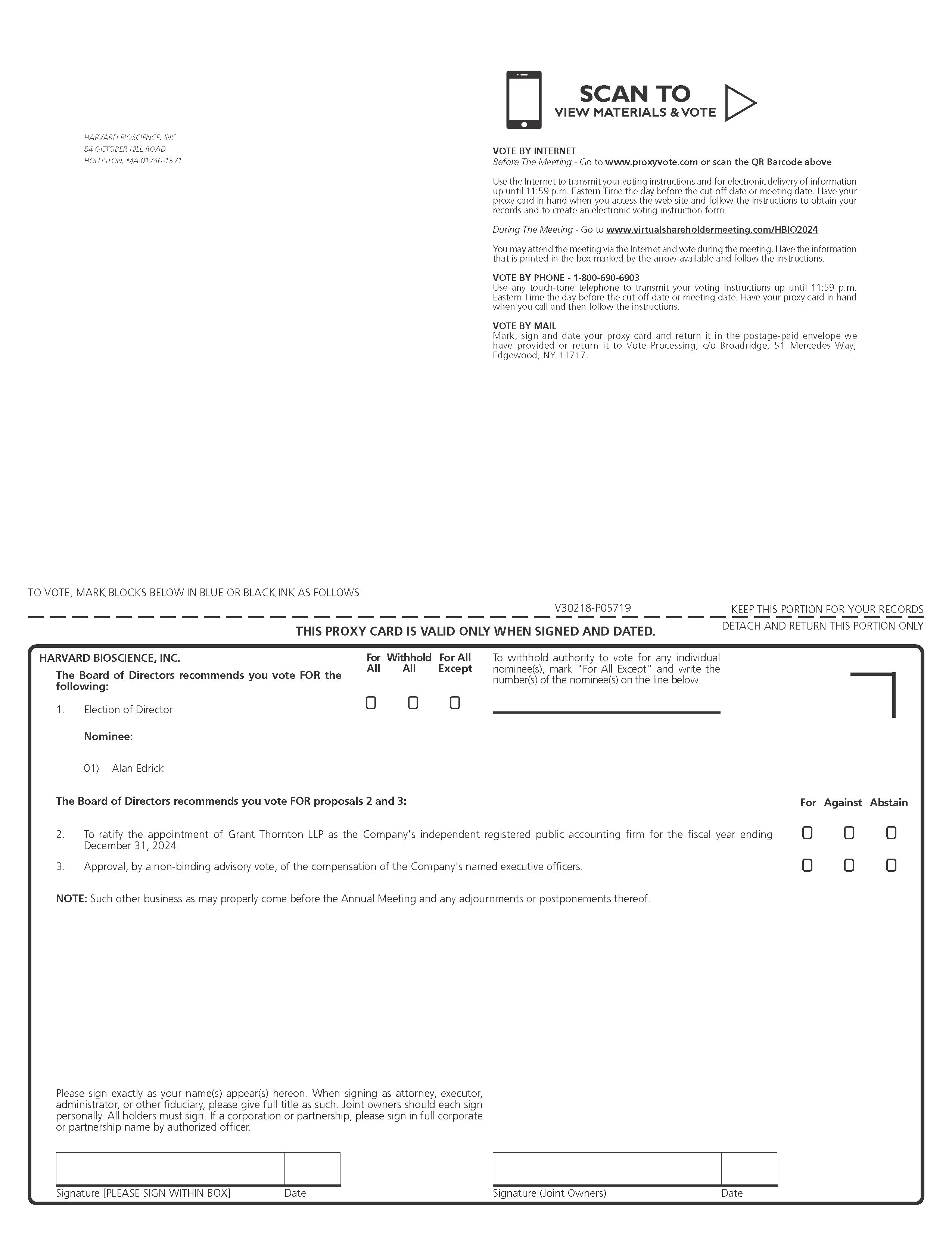 You are cordially invited to attend the 2024 Annual Meeting of Stockholders of Harvard Bioscience, Inc. (the “Annual Meeting”) to be held on Tuesday, May 14, 2024 at 11:00 a.m. EDT. The Annual Meeting will be held by virtual meeting only. You will not be able to attend the Annual Meeting in person. To be admitted to the Annual Meeting at www.virtualshareholdermeeting.com/HBIO2024, you must enter the control number found on your proxy card, voting instruction form or notice you previously received. You may vote during the Annual Meeting by following the instructions available on the meeting website during the meeting. At the meeting, we will be voting on the matters described in the accompanying proxy statement.