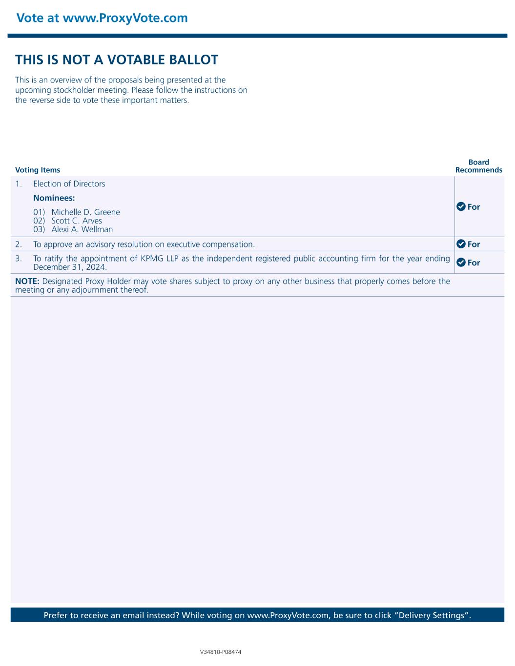 THIS IS NOT A VOTABLE BALLOT This is an overview of the proposals being presented at the upcoming stockholder meeting. Please follow the instructions on the reverse side to vote these important matters. Vote at www.ProxyVote.com Prefer to receive an email instead? While voting on www.ProxyVote.com, be sure to click “Delivery Settings”. V34810-P08474 Voting Items Board Recommends 1. Election of Directors For Nominees: 01) Michelle D. Greene 02) Scott C. Arves 03) Alexi A. Wellman 2. To approve an advisory resolution on executive compensation. For 3. To ratify the appointment of KPMG LLP as the independent registered public accounting firm for the year ending December 31, 2024. For NOTE: Designated Proxy Holder may vote shares subject to proxy on any other business that properly comes before the meeting or any adjournment thereof.