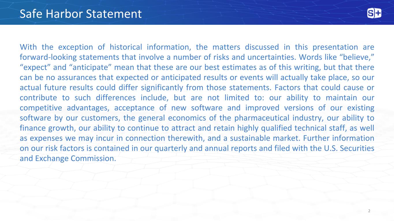 With the exception of historical information, the matters discussed in this presentation are forward-looking statements that involve a number of risks and uncertainties. Words like “believe,” “expect” and “anticipate” mean that these are our best estimates as of this writing, but that there can be no assurances that expected or anticipated results or events will actually take place, so our actual future results could differ significantly from those statements. Factors that could cause or contribute to such differences include, but are not limited to: our ability to maintain our competitive advantages, acceptance of new software and improved versions of our existing software by our customers, the general economics of the pharmaceutical industry, our ability to finance growth, our ability to continue to attract and retain highly qualified technical staff, as well as expenses we may incur in connection therewith, and a sustainable market. Further information on our risk factors is contained in our quarterly and annual reports and filed with the U.S. Securities and Exchange Commission. Safe Harbor Statement 2