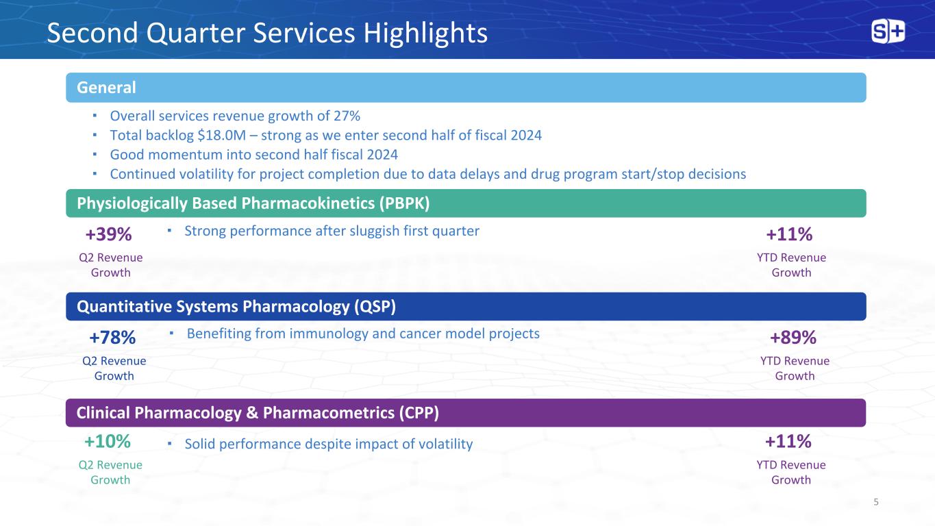 ▪ Overall software revenue growth of 11% ▪ Good renewal rate, upsell and new logo activity ▪ Active and strong pipeline Second Quarter Software Highlights +38% +2% ▪ 6 new customers ▪ 9 upsells to existing customers ▪ 8 new customers ▪ 18 upsells to existing customers +14% Q2 Revenue Growth Q2 Revenue Growth Q2 Revenue Growth General GastroPlus® (Physiologically Based Pharmacokinetics) MonolixSuite® (Clinical Pharmacology & Pharmacometrics) ADMET Predictor® (Cheminformatics) ▪ 7 new customers ▪ 10 upsells to existing customers 4 +21% +11% +10% YTD Revenue Growth YTD Revenue Growth YTD Revenue Growth