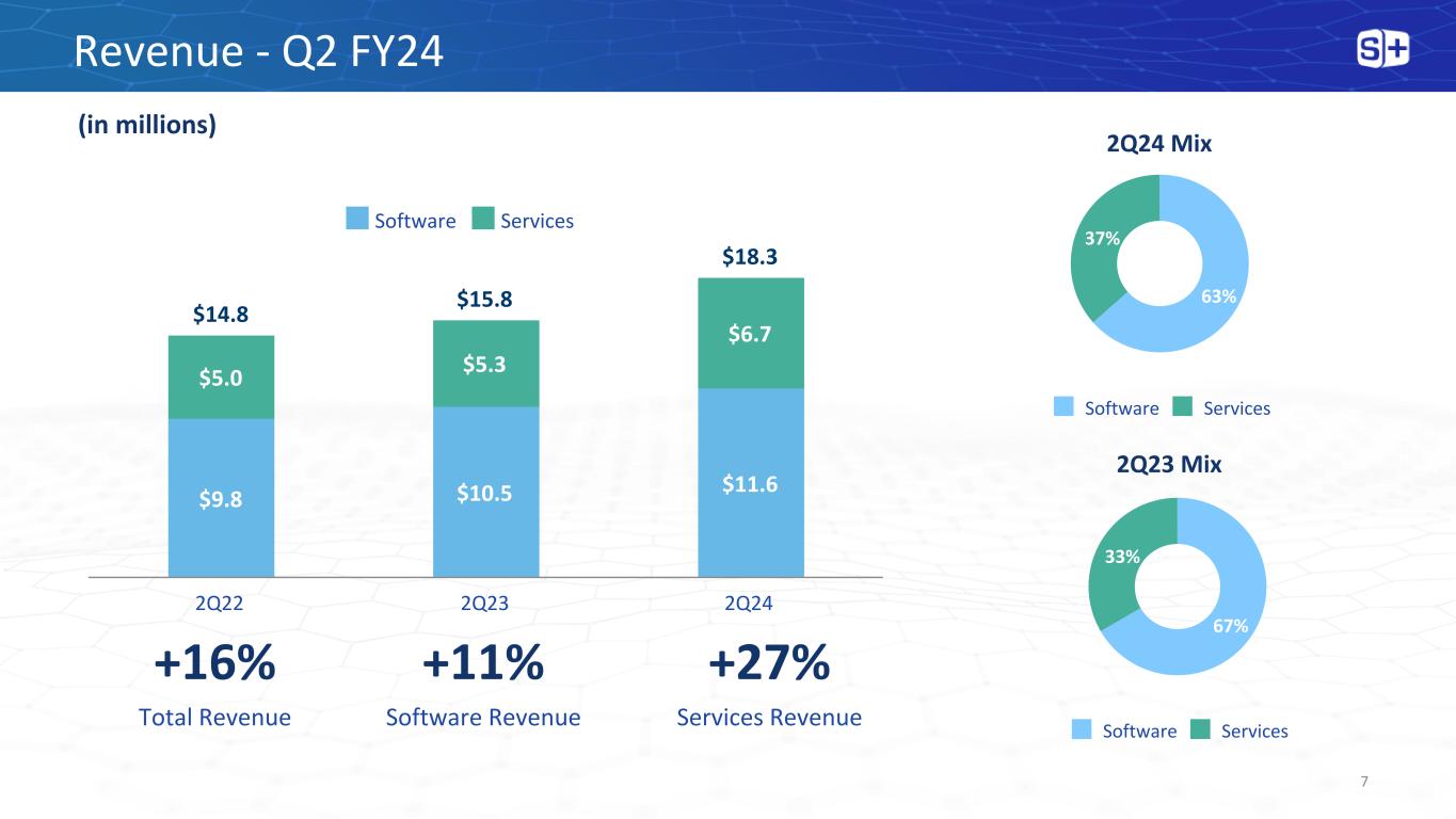 •Software revenue increased 11% to $11.6 million, representing 63% of total revenue