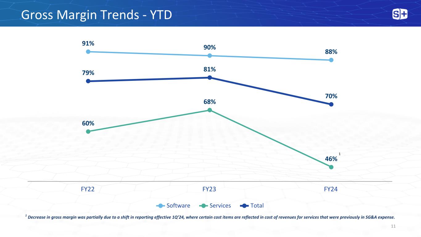 Gross Margin Trends - Q2 FY24 10 92% 92% 88% 59% 66% 44% 81% 83% 72% Software Services Total 2Q22 2Q23 2Q24 1 Decrease in gross margin was partially due to a shift in reporting effective 1Q’24, where certain cost items are reflected in cost of revenues for services that were previously in SG&A expense. 1
