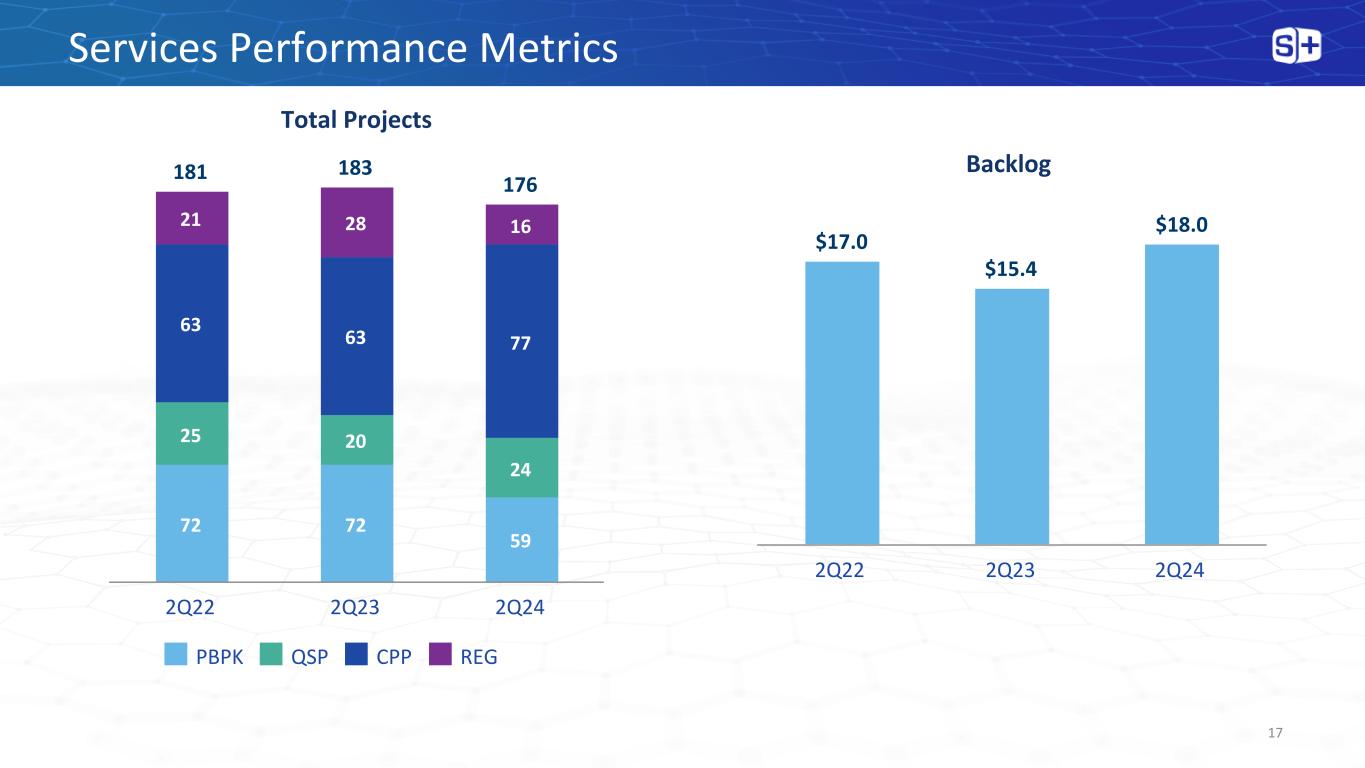 $17.0 $15.4 $18.0 2Q22 2Q23 2Q24 72 72 59 25 20 24 63 63 77 21 28 16 181 183 176 PBPK QSP CPP REG 2Q22 2Q23 2Q24 Services Performance Metrics Total Projects Backlog 17