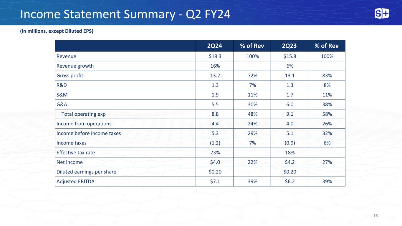 Income Statement Summary - YTD 19 2Q24 % of Rev 2Q23 % of Rev Revenue $32.8 100% $27.7 100% Revenue growth 18% 2% Gross profit 23.1 70% 22.4 81% R&D 2.5 8% 2.5 9% S&M 3.9 12% 3.2 12% G&A 11.2 34% 11.8 43% Total operating exp 17.7 54% 17.5 63% Income from operations 5.4 16% 4.9 18% Income before income taxes 7.7 23% 6.7 24% Income taxes (1.7) 5% (1.3) 5% Effective tax rate 22% 19% Net income $6.0 18% $5.4 20% Diluted earnings per share $0.29 $0.26 Adjusted EBITDA $10.5 32% $9.2 33% (in millions, except Diluted EPS)