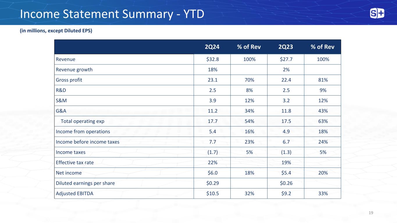 Income Statement Summary - Q2 FY24 18 (in millions, except Diluted EPS) 2Q24 % of Rev 2Q23 % of Rev Revenue $18.3 100% $15.8 100% Revenue growth 16% 6% Gross profit 13.2 72% 13.1 83% R&D 1.3 7% 1.3 8% S&M 1.9 11% 1.7 11% G&A 5.5 30% 6.0 38% Total operating exp 8.8 48% 9.1 58% Income from operations 4.4 24% 4.0 26% Income before income taxes 5.3 29% 5.1 32% Income taxes (1.2) 7% (0.9) 6% Effective tax rate 23% 18% Net income $4.0 22% $4.2 27% Diluted earnings per share $0.20 $0.20 Adjusted EBITDA $7.1 39% $6.2 39%