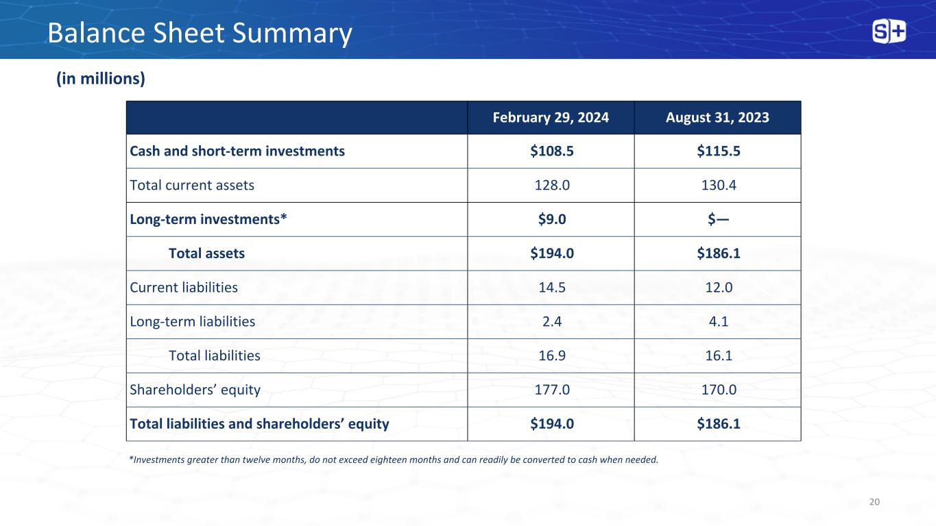 Balance Sheet Summary 20 February 29, 2024 August 31, 2023 Cash and short-term investments $108.5 $115.5 Total current assets 128.0 130.4 Long-term investments* $9.0 $— Total assets $194.0 $186.1 Current liabilities 14.5 12.0 Long-term liabilities 2.4 4.1 Total liabilities 16.9 16.1 Shareholders’ equity 177.0 170.0 Total liabilities and shareholders’ equity $194.0 $186.1 (in millions) *Investments greater than twelve months, do not exceed eighteen months and can readily be converted to cash when needed.
