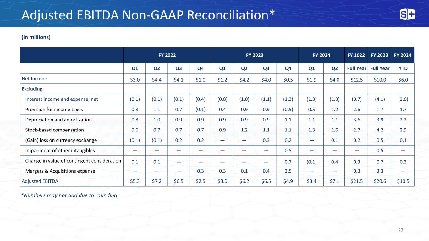 Adjusted EBITDA Non-GAAP Reconciliation* 23 FY 2022 FY 2023 FY 2024 FY 2022 FY 2023 FY 2024 Q1 Q2 Q3 Q4 Q1 Q2 Q3 Q4 Q1 Q2 Full Year Full Year YTD Net Income $3.0 $4.4 $4.1 $1.0 $1.2 $4.2 $4.0 $0.5 $1.9 $4.0 $12.5 $10.0 $6.0 Excluding: Interest income and expense, net (0.1) (0.1) (0.1) (0.4) (0.8) (1.0) (1.1) (1.3) (1.3) (1.3) (0.7) (4.1) (2.6) Provision for income taxes 0.8 1.1 0.7 (0.1) 0.4 0.9 0.9 (0.5) 0.5 1.2 2.6 1.7 1.7 Depreciation and amortization 0.8 1.0 0.9 0.9 0.9 0.9 0.9 1.1 1.1 1.1 3.6 3.9 2.2 Stock-based compensation 0.6 0.7 0.7 0.7 0.9 1.2 1.1 1.1 1.3 1.6 2.7 4.2 2.9 (Gain) loss on currency exchange (0.1) (0.1) 0.2 0.2 — — 0.3 0.2 — 0.1 0.2 0.5 0.1 Impairment of other intangibles — — — — — — — 0.5 — — — 0.5 — Change in value of contingent consideration 0.1 0.1 — — — — — 0.7 (0.1) 0.4 0.3 0.7 0.3 Mergers & Acquisitions expense — — — 0.3 0.3 0.1 0.4 2.5 — — 0.3 3.3 — Adjusted EBITDA $5.3 $7.2 $6.5 $2.5 $3.0 $6.2 $6.5 $4.9 $3.4 $7.1 $21.5 $20.6 $10.5 (in millions) *Numbers may not add due to rounding